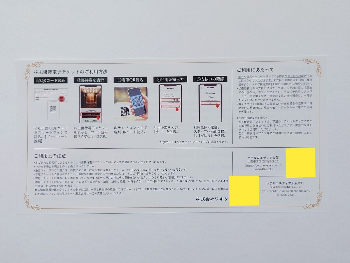 ワキタ;株主優待券 ホテルコルディア 宿泊 30,000円分。電子チケット。 有効期限:2026年5月末 ・ホテルコルディア大阪・ホテルコルディア大阪本町 その他、使用方法等については企業のホームページ等でご確認お願いします。 匿名配送。