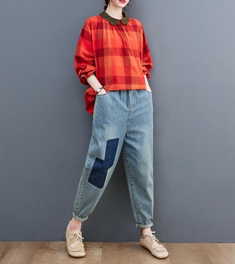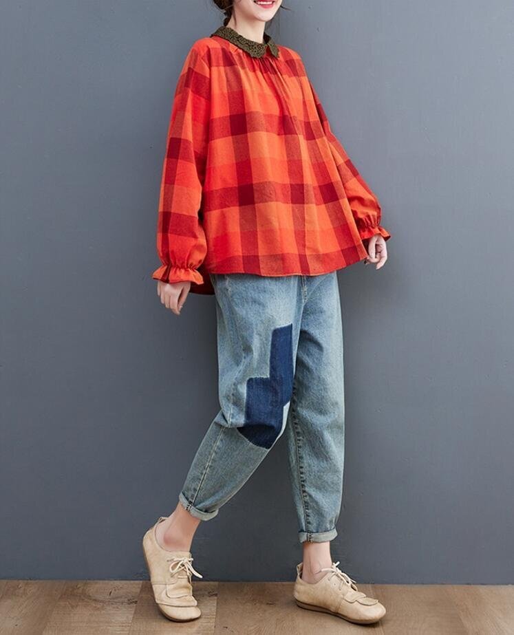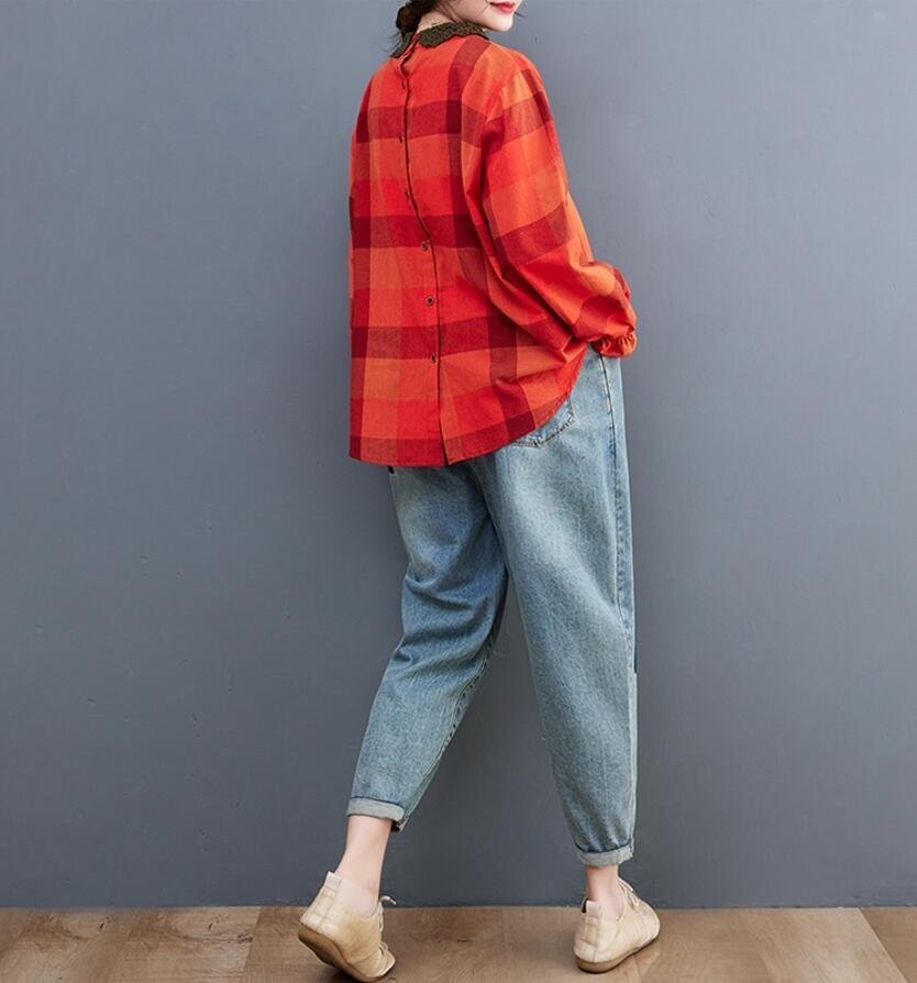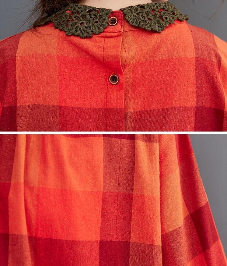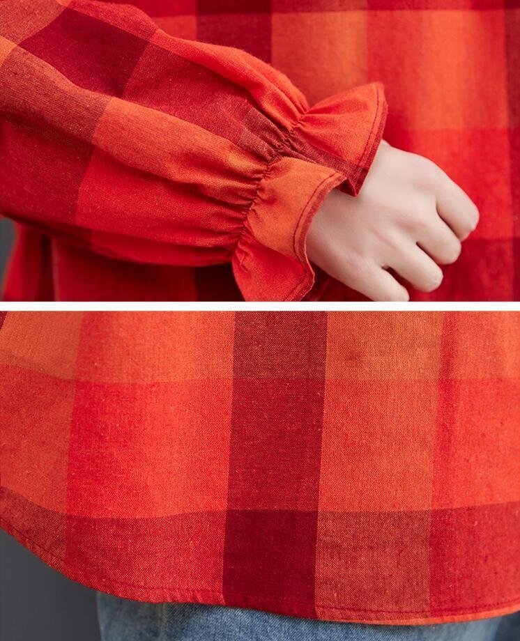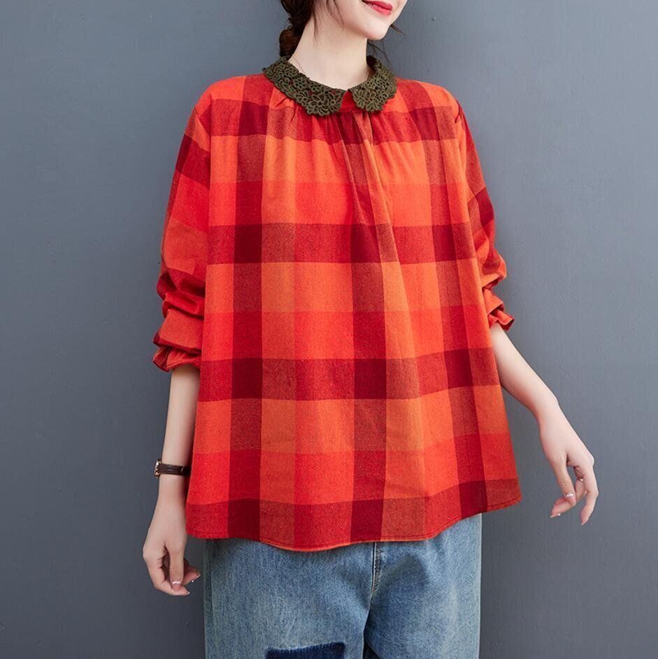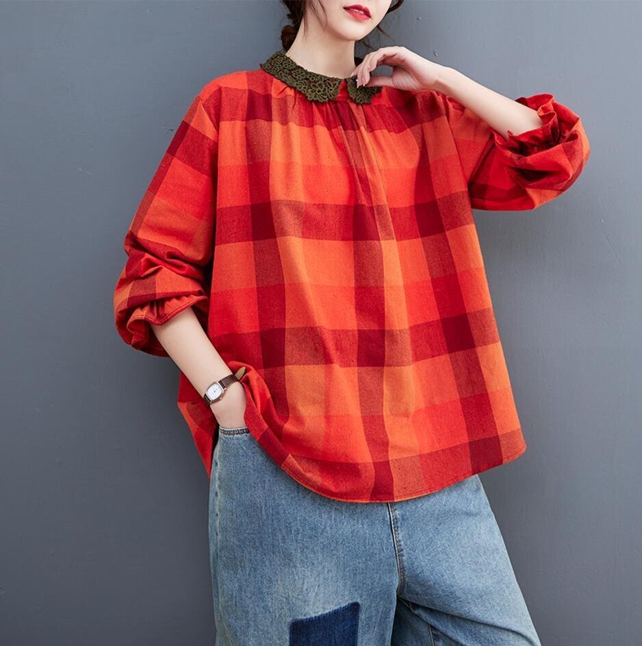 春新品 カジュアル 大きいサイズ チュニック レース襟 おしゃれ 綿麻 チェック 柄 長袖 トップス★赤/2XLサイズ