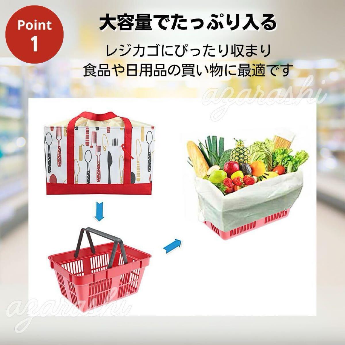 スーパーのレジカゴにぴったり収まる設計で、商品を袋に詰め直す手間が一切不要。買い物の時短にもつながります。大容量タイプだから、まとめ買いにも大活躍!