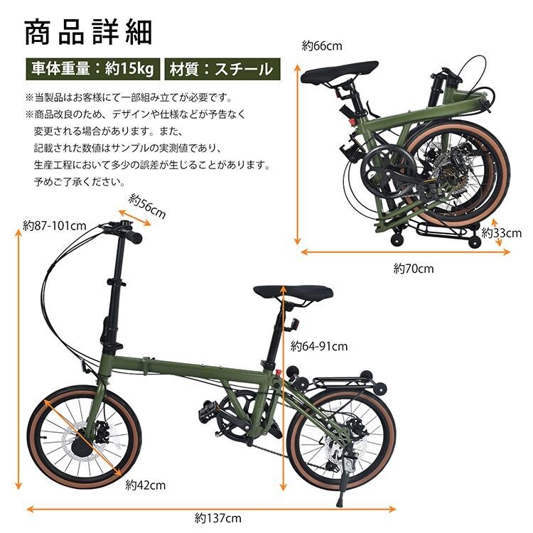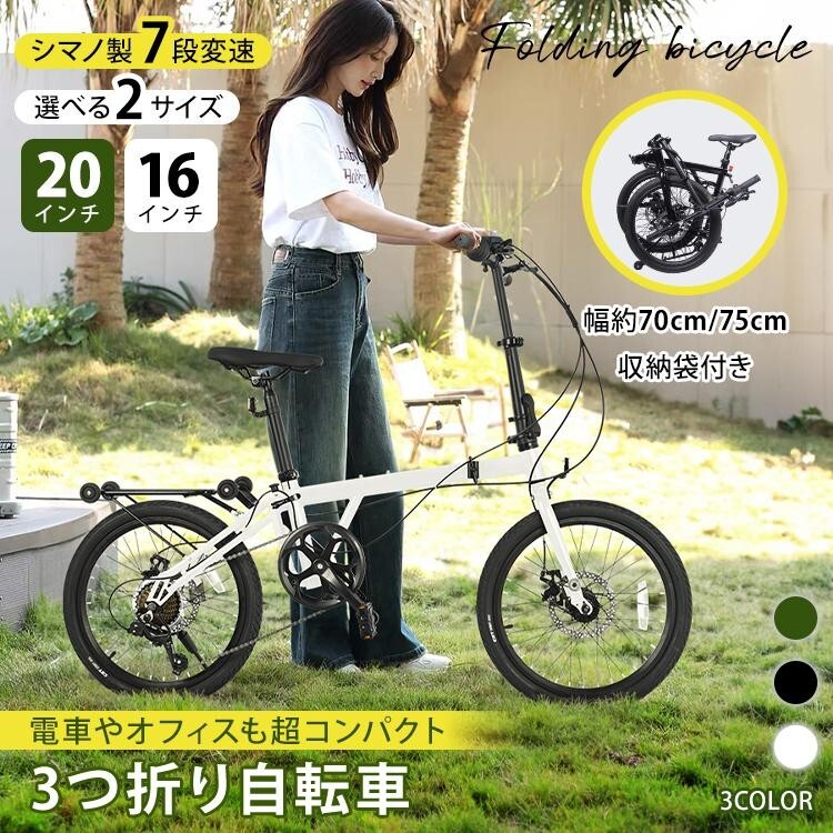 送料無料 折りたたみ自転車 3つ折り 16インチ シマノ7段ギア ハンドル高さ調節 サドル高さ調節 収納袋付き コンパクト 7段変速 ee418-16