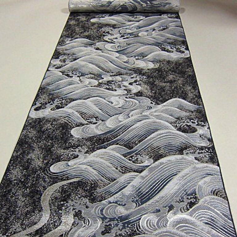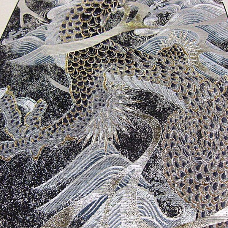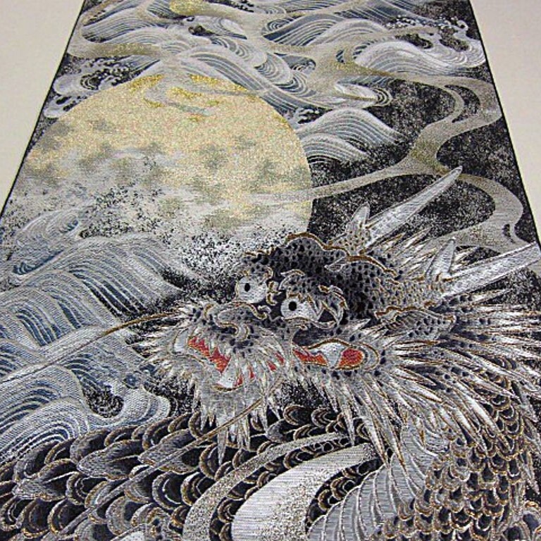 新品未仕立・西陣織丸巻袋帯【昇龍】です。西陣織物工業組合証紙番号 2349 天に舞う昇龍や荒波などの柄が意匠された、西陣織袋帯<昇龍>でございます。龍は雷雲や嵐を呼び、天空に昇り自在に飛翔することから雨乞いなどに祀られ、古来より神秘的な想像上の生き物として親しまれてきました。あらゆる運の上昇を願い創作された出世帯でございます。迫力ある逸品です。織りあがったばかりのお品になります。