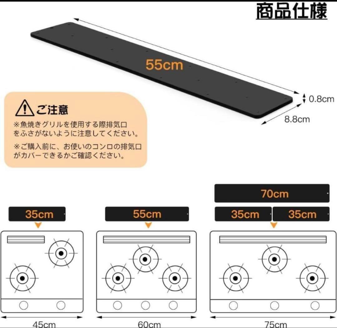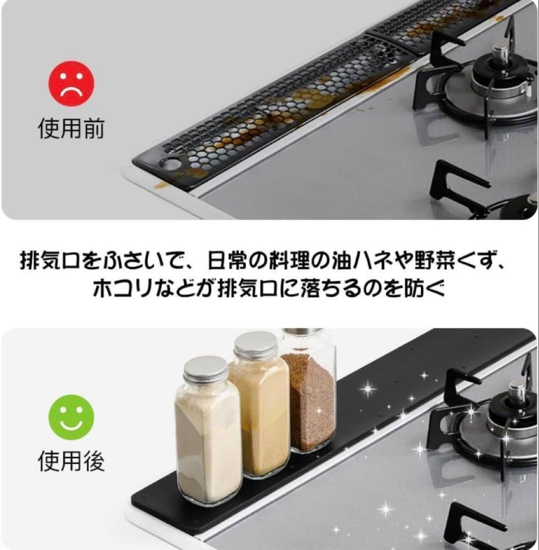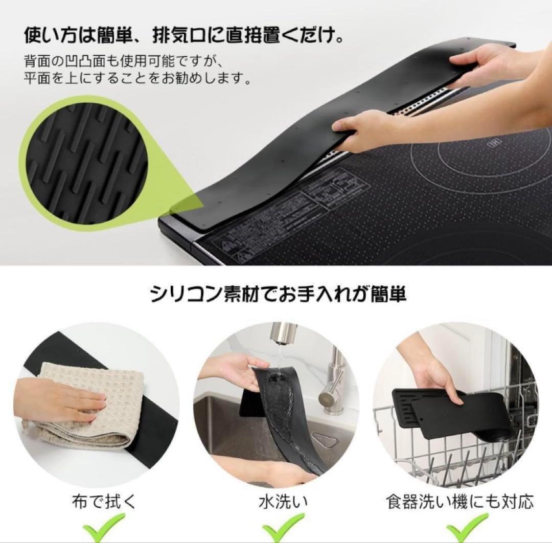 サイズ:(約)幅35×奥行8.8×高さ0.5cm。材質:シリコン。※ご注意:魚焼きグリルを使用する際排気口をふさがないように注意してください。 ご購入前に、お使いのコンロの排気口がカバーできるかご確認ください。
