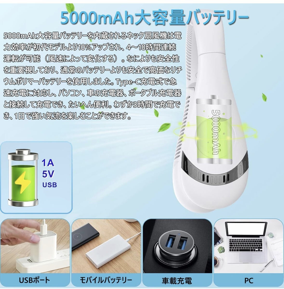 【5000mAh大容量バッテリー&LEDバッテリー残量表示】5000mAh大容量バッテリーを内蔵されるネック扇風機は電力効率が初代モデルより10%アップされ、4~18時間連続運転が可能(風速によって変化する)。なによりも安全性を重要視しており、通常のバッテリーよりも安全で高価なリチウムポリマーバッテリーを使用しました。Type-C充電式で急速充電に対応し、パソコン、車の充電器、ポータブル充電器と接続して充電でき、たいへん便利。わずか3時間で充電でき、1日で強い気流を楽しむことができます。このネックファンにはLEDディスプレイが搭載されており、1-3つの風度とバッテリ残量を表示し、風速の調整やバッテリ残量の表示を容易にし、バッテリ-容量は、画面に表示することができるので、タイムリー充電ができます。