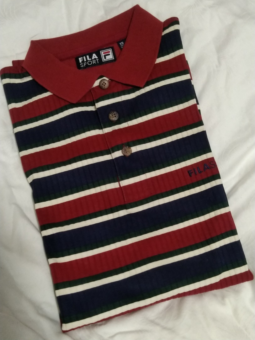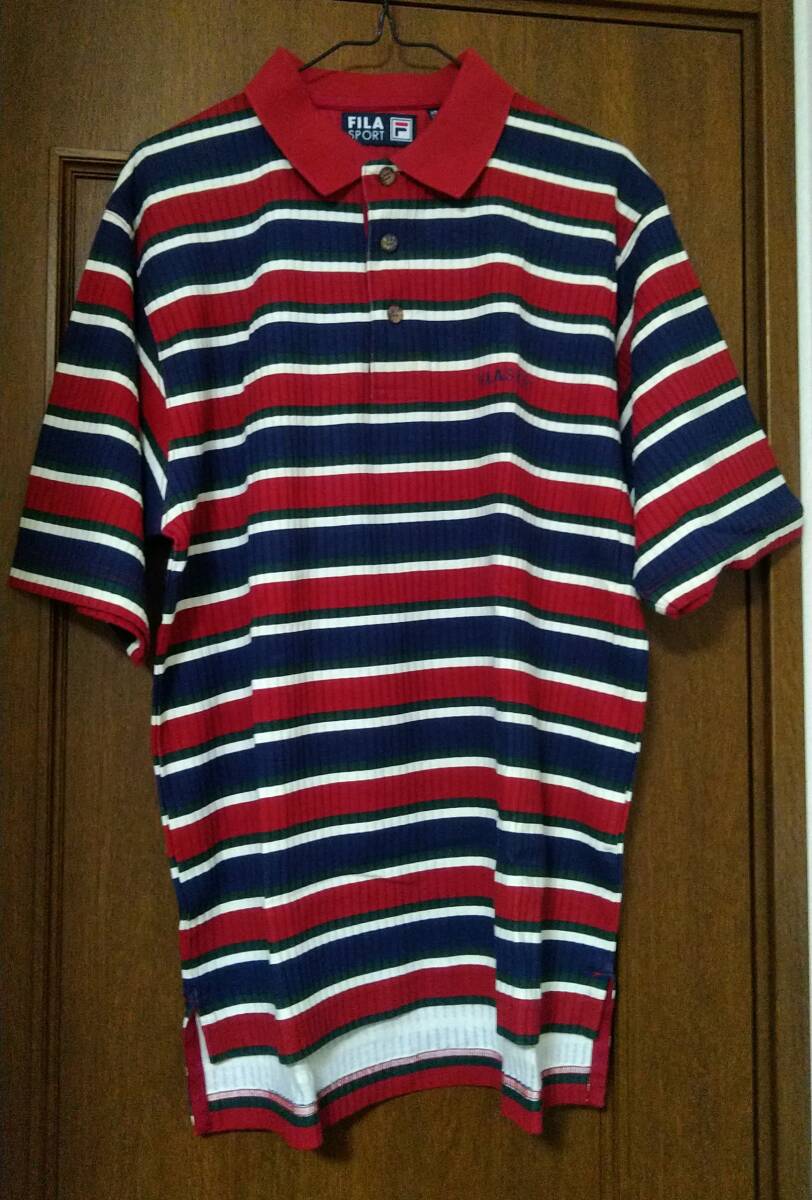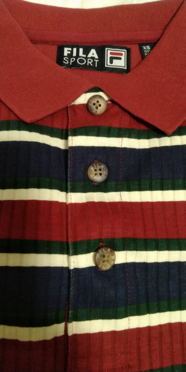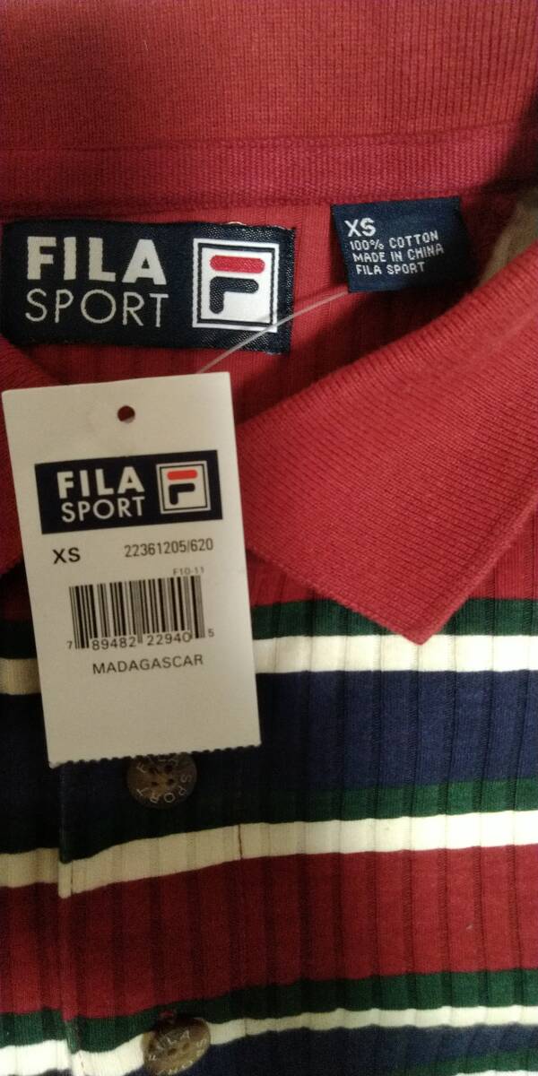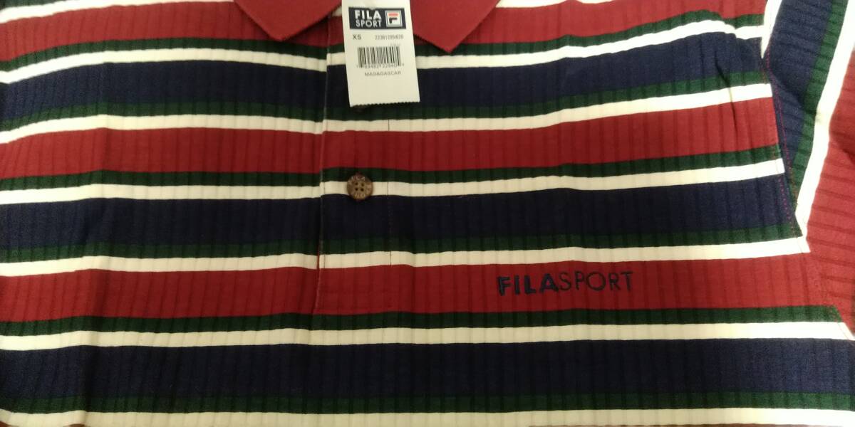 【新品未使用★タグ付】FILA SPORTS 半袖ポロシャツ メンズL相当(表記XS)◆赤×紺×白×緑ボーダー 綿100%◆MADAGASCAR記載タグ◆胸元刺繍
