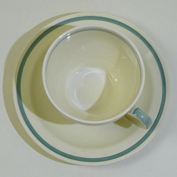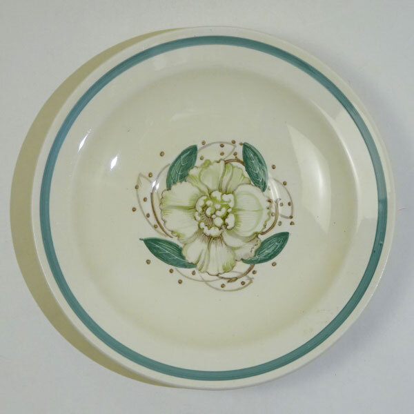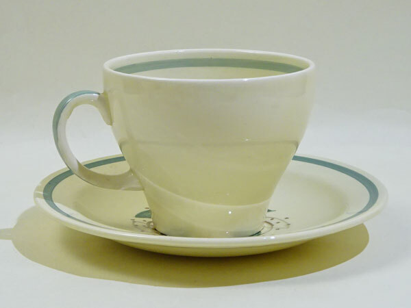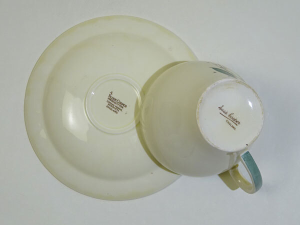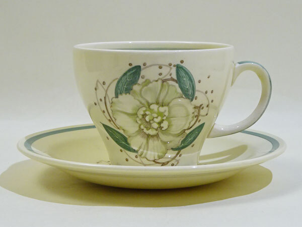 くちなしの花が大胆にあしらわれた1950年に発表されたスージークーパーの美意識と時代感覚が表現されたカップ&ソーサー。モチーフは大ぶりながらもグリーンとベージュを基調とした控えめなトーンで描かれており、アンティーク感がありつつも静謐な気品が漂っている品です。