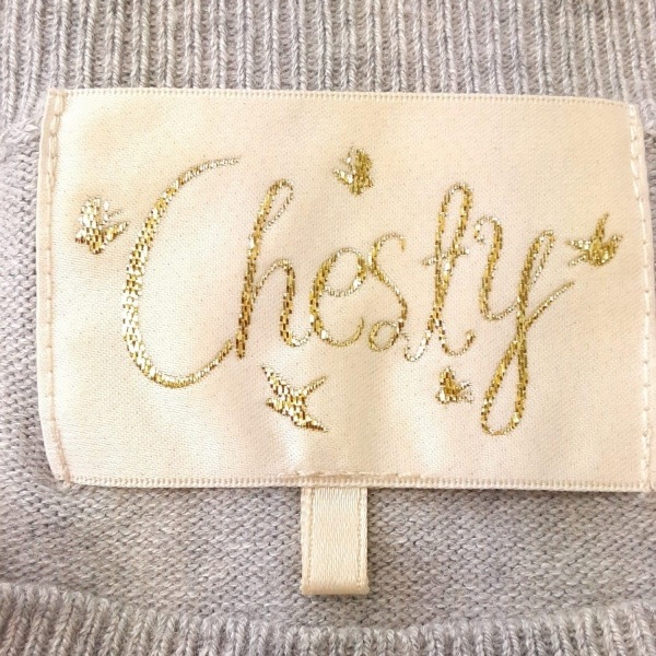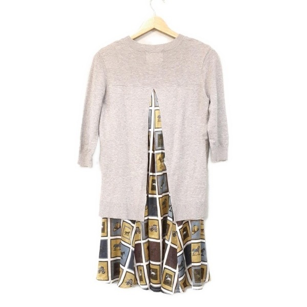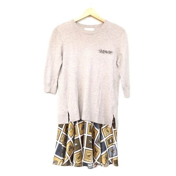 チェスティ Chesty サイズ0 XS - グレー×カーキ×マルチ レディース クルーネック/七分袖/ひざ丈/ニット/ビジュー/馬 美品 ワンピース
