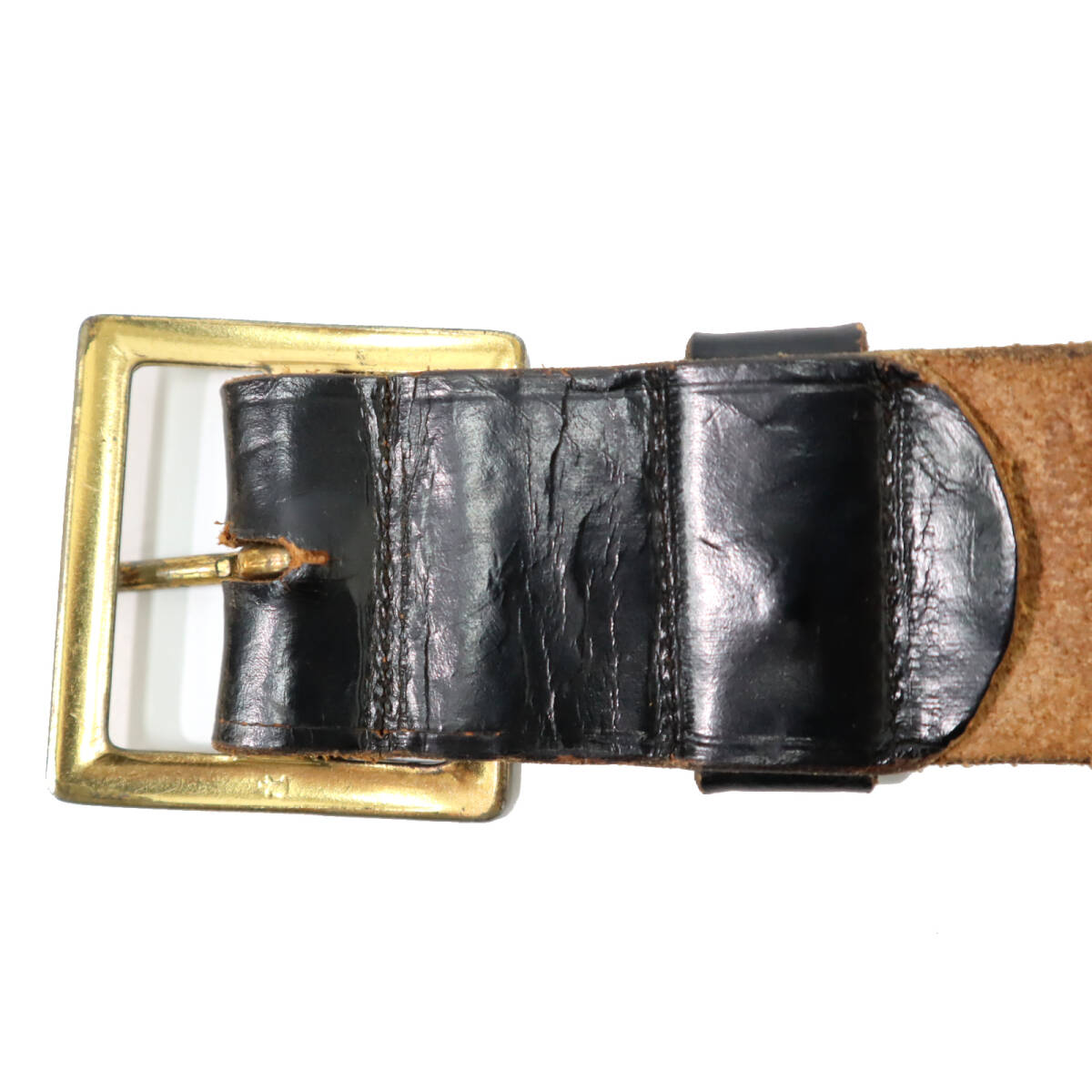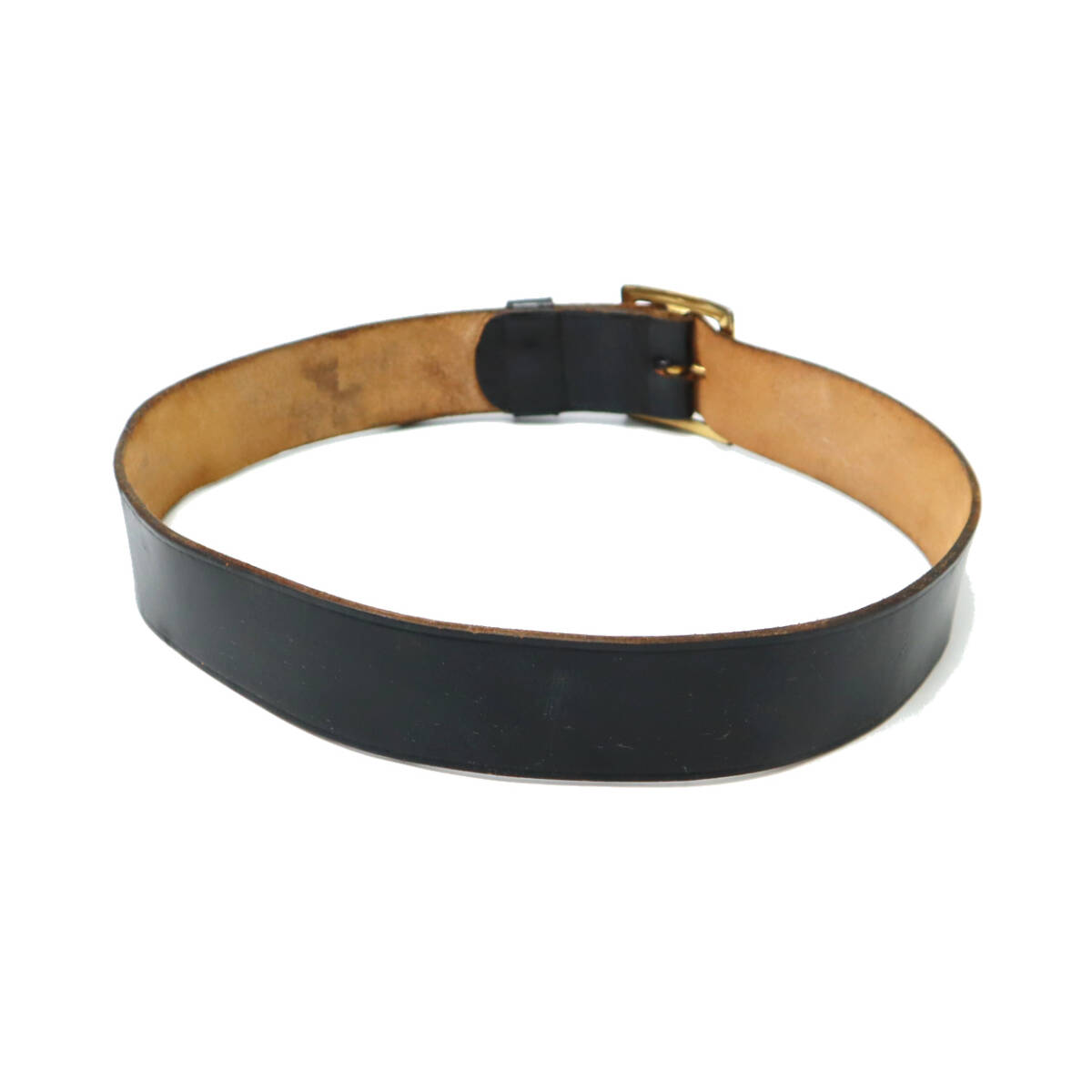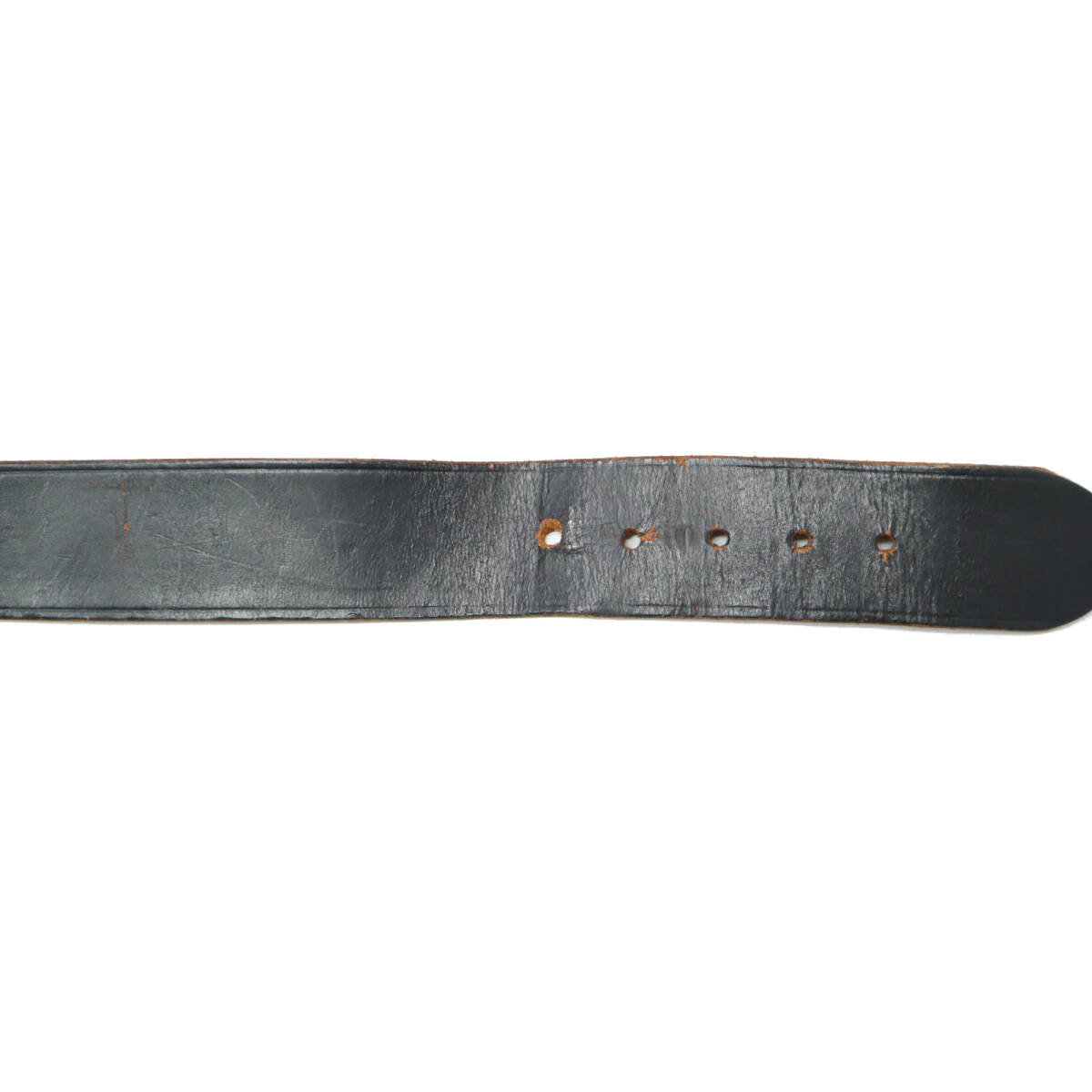 【状態】 バックルに傷やメッキの剥がれ、レザーに多くの傷や擦れ、裏面にシミ汚れ、多少の曲がり、レザー表面に細かなヒビがございます。ステッチの縫い目に小さな切れ、バックル付近やベルト穴付近のレザーが柔らかくなっていますので、他に比べ弱くなっている可能性がございます。全体的にレザーは柔らかく、試着もしてあり、簡単に切れそうな状態ではございませんが、古い物となりますので、ある程度は気にかけてご使用頂いた方が宜しいかと思います。ベルト裏面(スエード面)が色落ちします。乾いた白生地で拭くと茶色が移り、ジーンズなどの着用でも接地面が茶色くなります。ブラシなどで簡単に落とせますが、古い天然素材の為、その点ご了承下さい。バックルあたりから、レザーの粉が落ちる事がございますが、普通にご使用頂けます。販売前に磨いてあります。