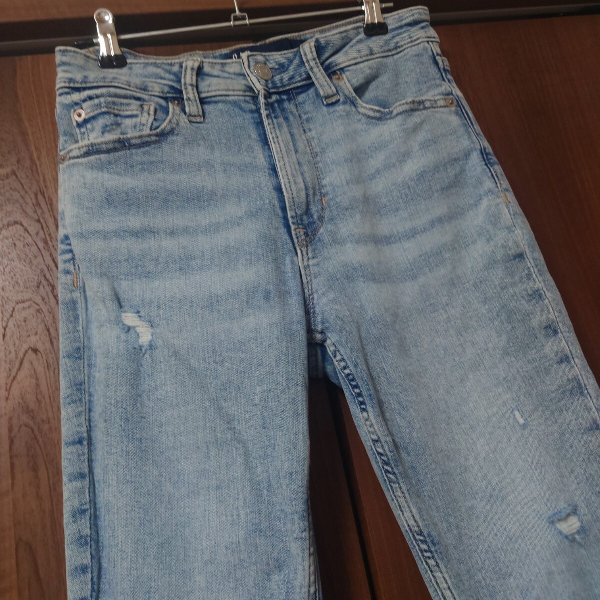 GAPのスキニーデニム、ダメージ加工でカジュアルスタイルに最適。