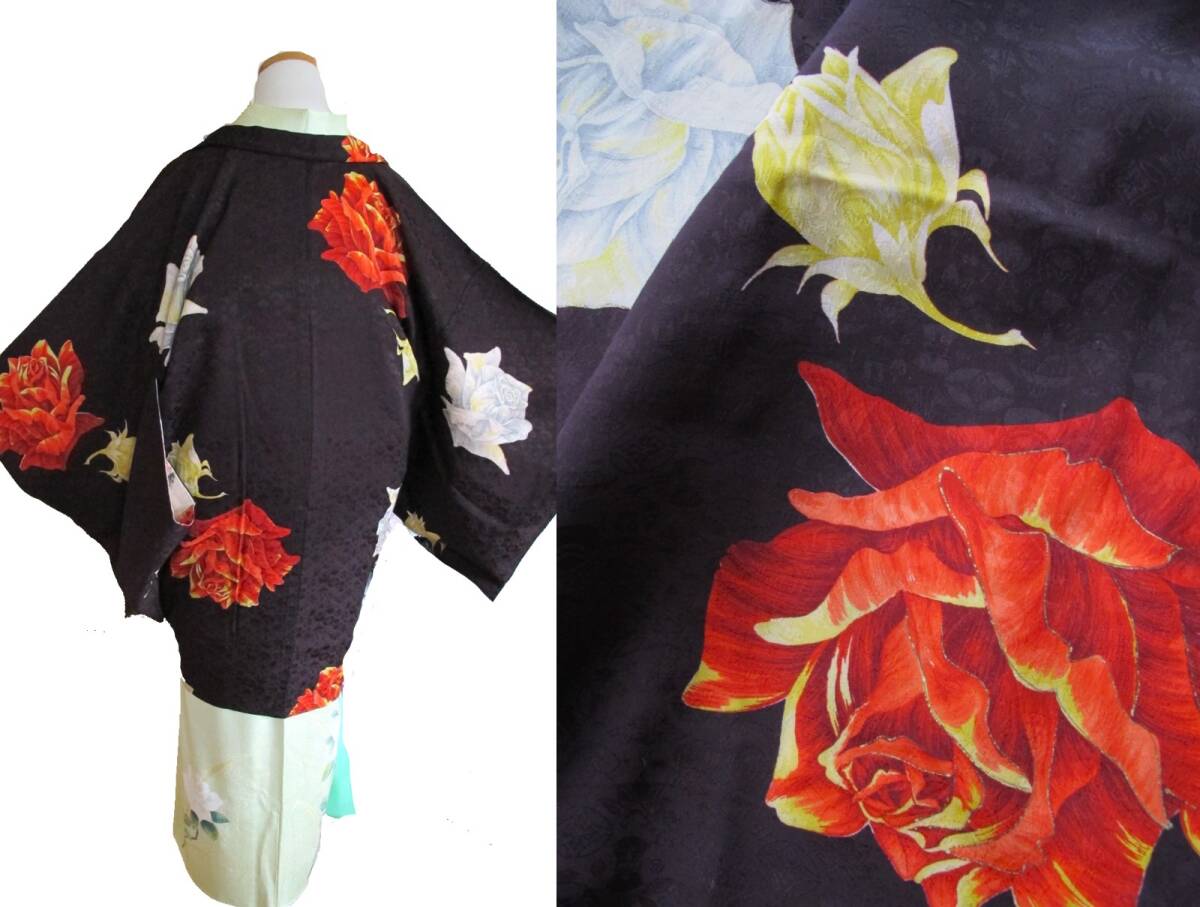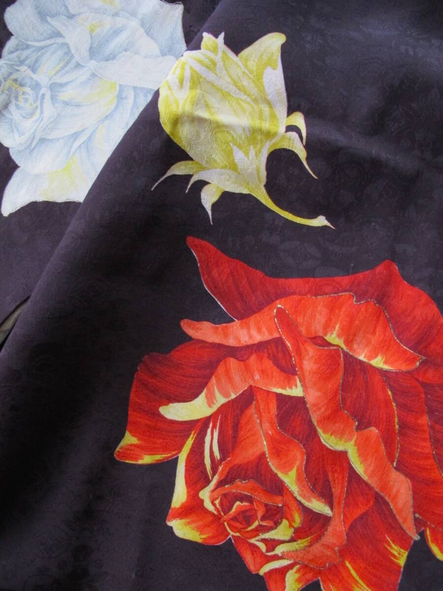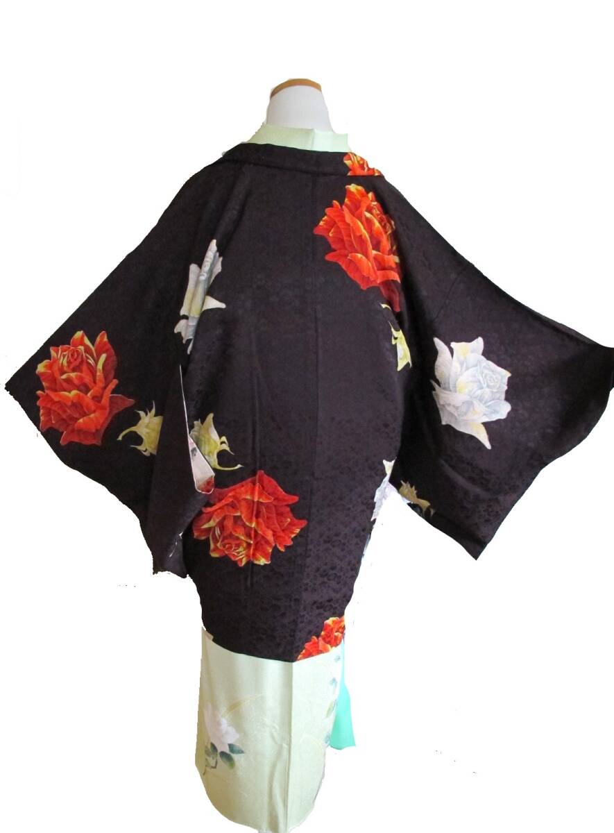 黒地に大輪の薔薇が華麗なアンティーク紋錦紗羽織です。 宝尽くしの地紋がお洒落です。金彩入りです。 |
