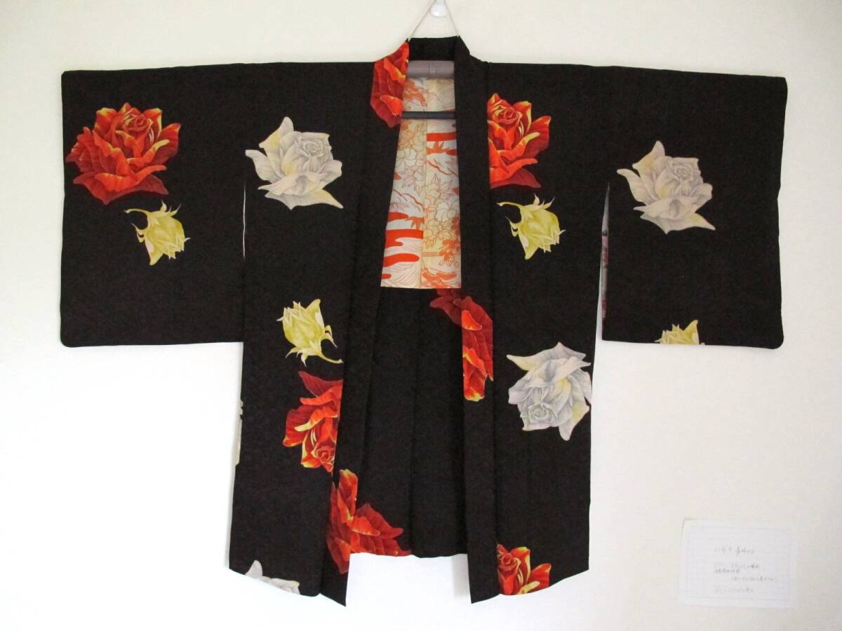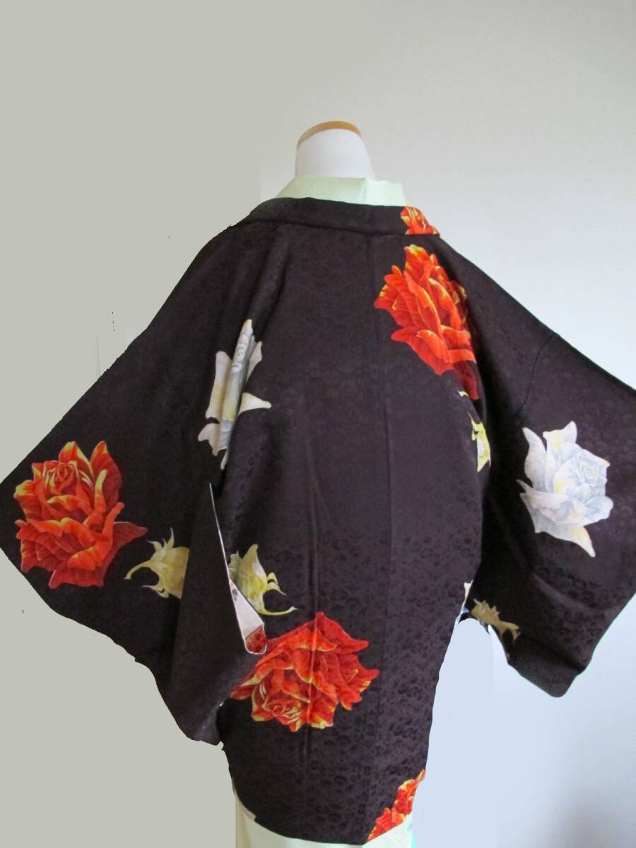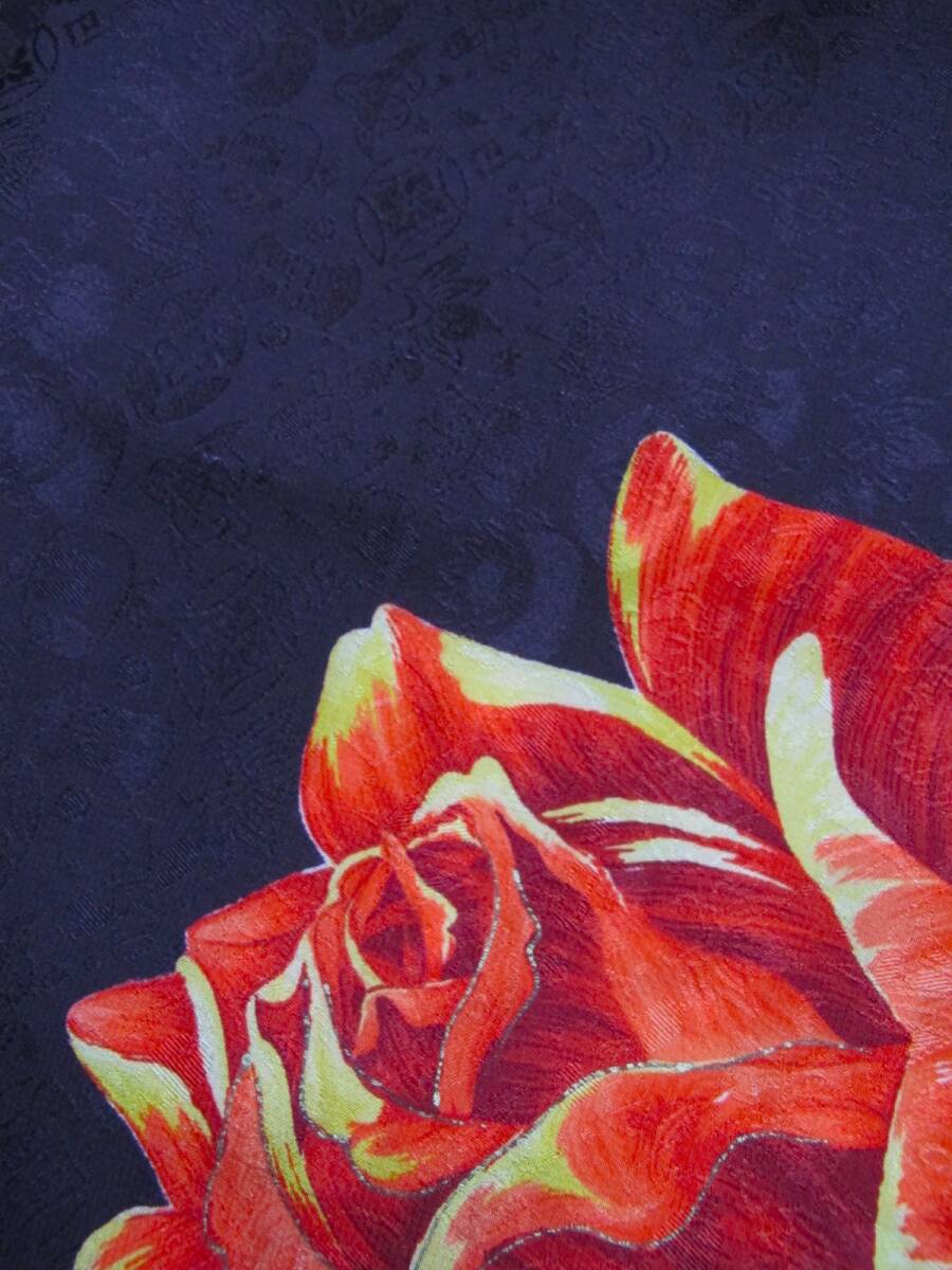 黒地に大輪の薔薇が華麗なアンティーク紋錦紗羽織です。 宝尽くしの地紋がお洒落です。金彩入りです。 |