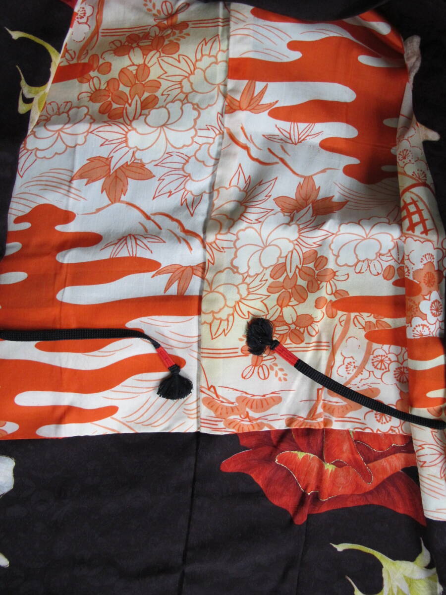 おおよその丈:身丈(肩)86.5cm、裄64cm、袖丈49cm、袖幅32m、前幅17cm、後幅28.5cm 素材:正絹 お色:黒 |