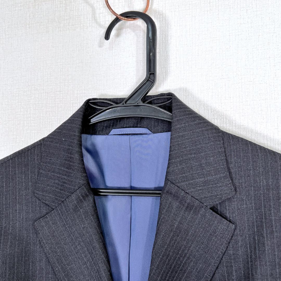 レディースのダークグレー系のストライプジャケット テーラードジャケットです。中古品ですが目立つ傷や汚れもなく、まだまだ使えます。ジャケットのみの販売となります。古着 ジェイプレス 株式会社オンワード樫山