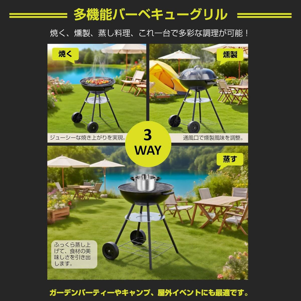 • 【多機能バーベキューグリル】多機能バーベキューグリル焼く、燻製、蒸し料理、これ一台で多彩な調理が可能!焼く:ジューシーな焼き上がりを実現。燻製:通風口で燻製風味を調整。蒸す:ふっくら蒸し上げて、食材の美味しさを引き出します。