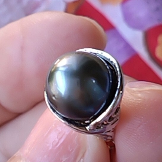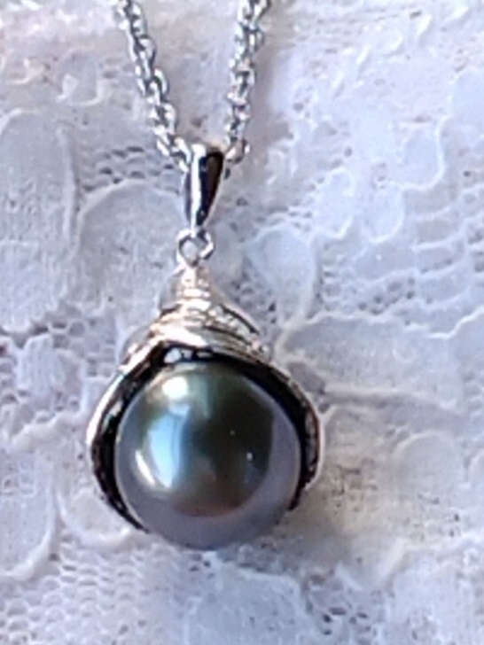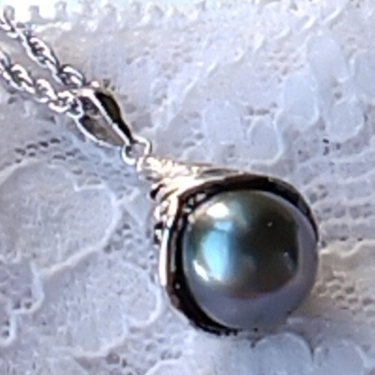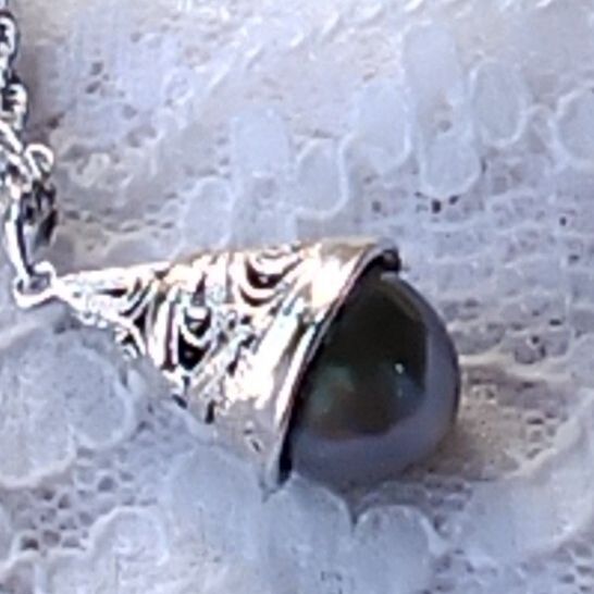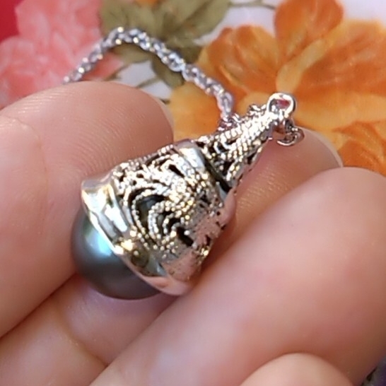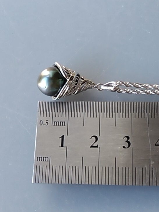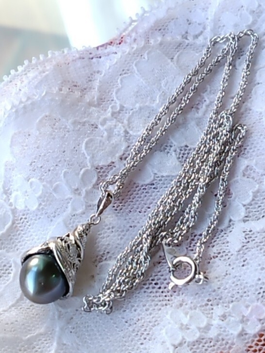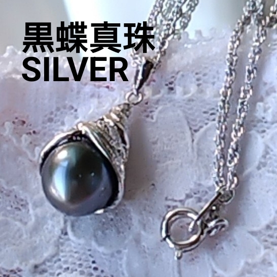 艷やかな黒蝶真珠がシルバーの繊細デザイン台座に包まれた美しいペンダントネックレスです。バチカンにSV刻印があります。
