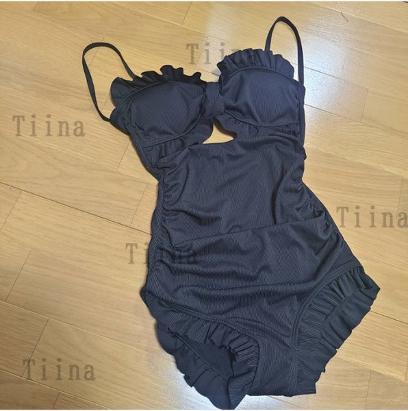 胸元 の リボン デカリボン とリブ 生地に フリル シフォン レース が 可愛い ワンピース モノキニ 水着 です*.