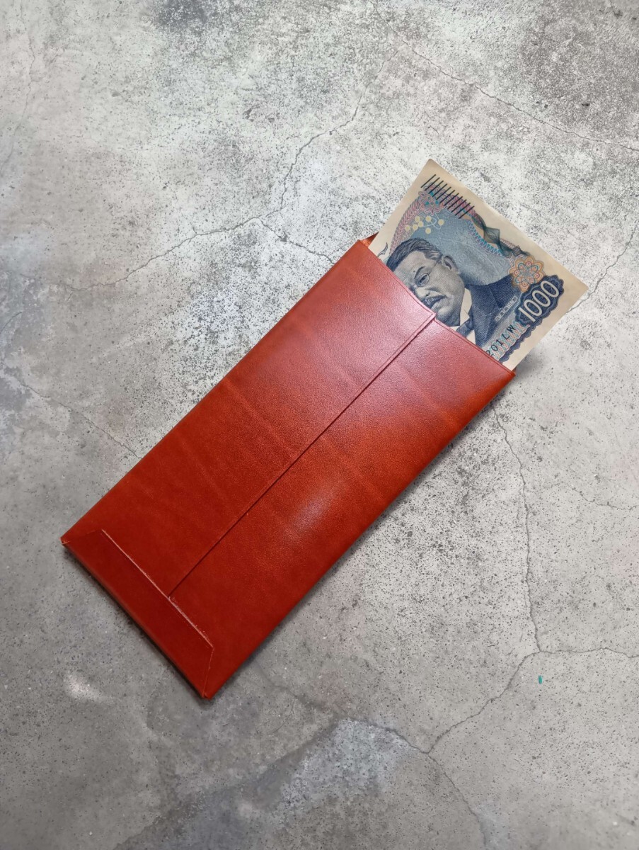 ベルギーの老舗マズール社によって製造される皮革「ルガトー(ルガトーショルダー)」の橙で製作したヘソクリ袋(革封筒)になります。