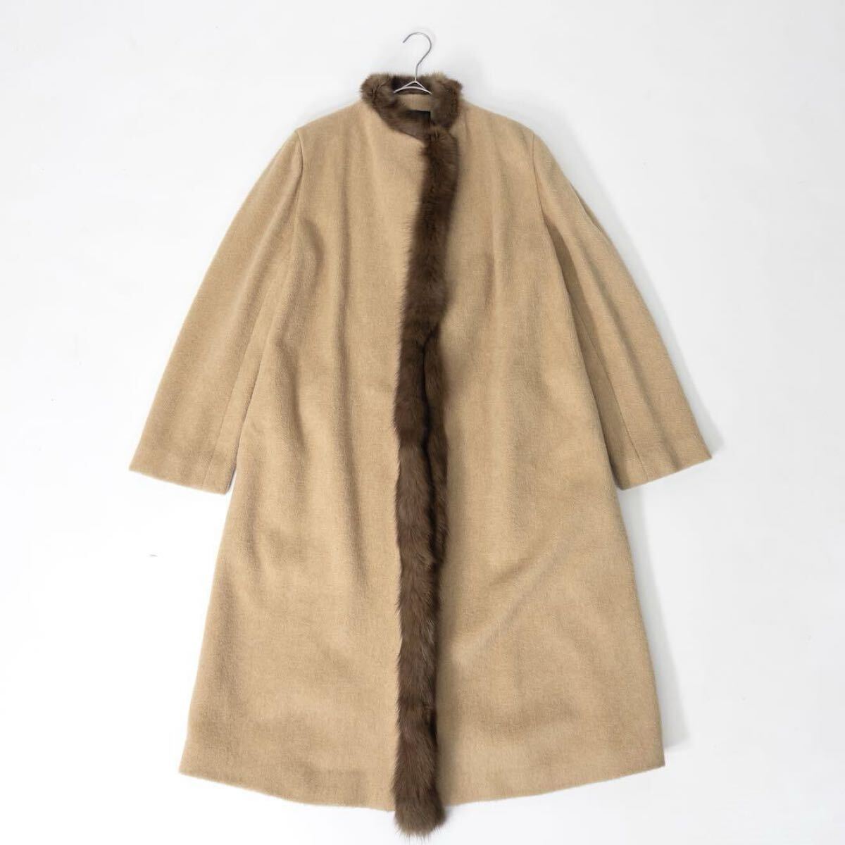 こちらは 高級素材キャメル を使用したロングコートに、さらに「毛皮の王様」と称される ロシアンセーブルファー をあしらった極上のアイテムです。