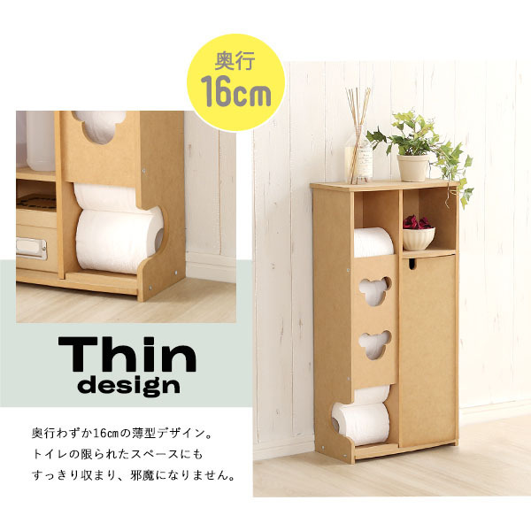 【ポイント】 生活感を抑えるペーパー収納! シンプルなデザインの中にクマ型の切り抜きがワンポイントに♪ トイレットペーパーは最大約6個収納可能です。 奥行わずか16㎝の薄型デザインです。 トイレの限られたスペースにもすっきり収まります。 収納棚は扉付きで衛生的!掃除用品もまとめて収納出来ます。 安心の日本製,軽くて組み立ても簡単です。 |