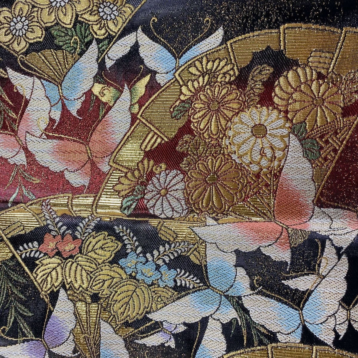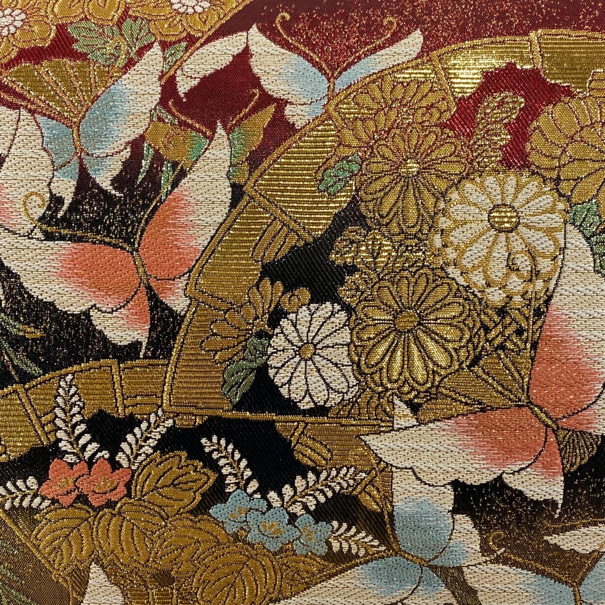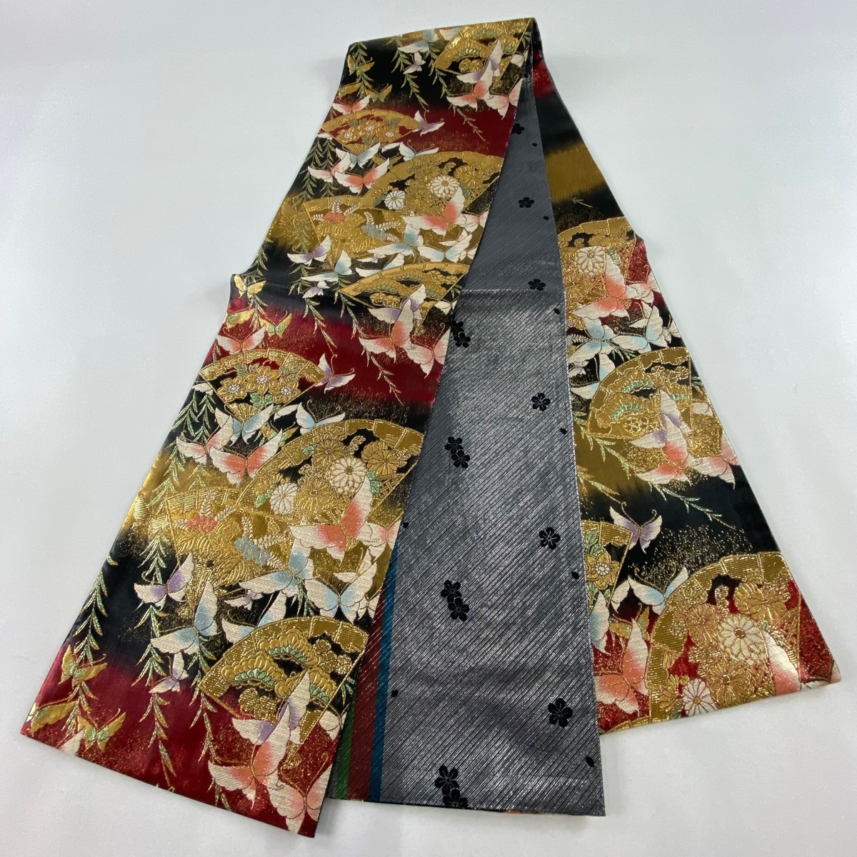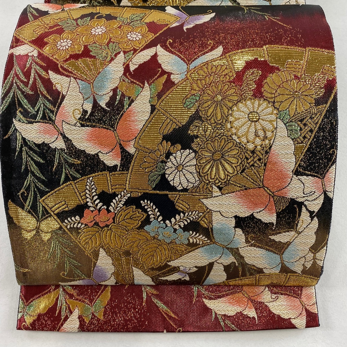 | 袋帯 美品 秀品 振袖向き 蝶 檜扇 金糸 箔 赤 六通 正絹 【中古】 |