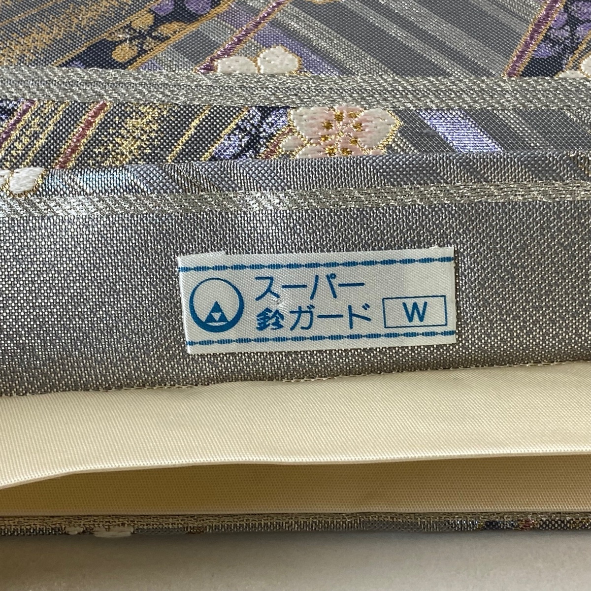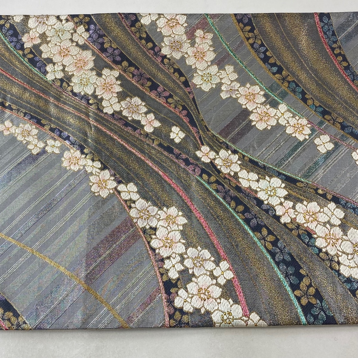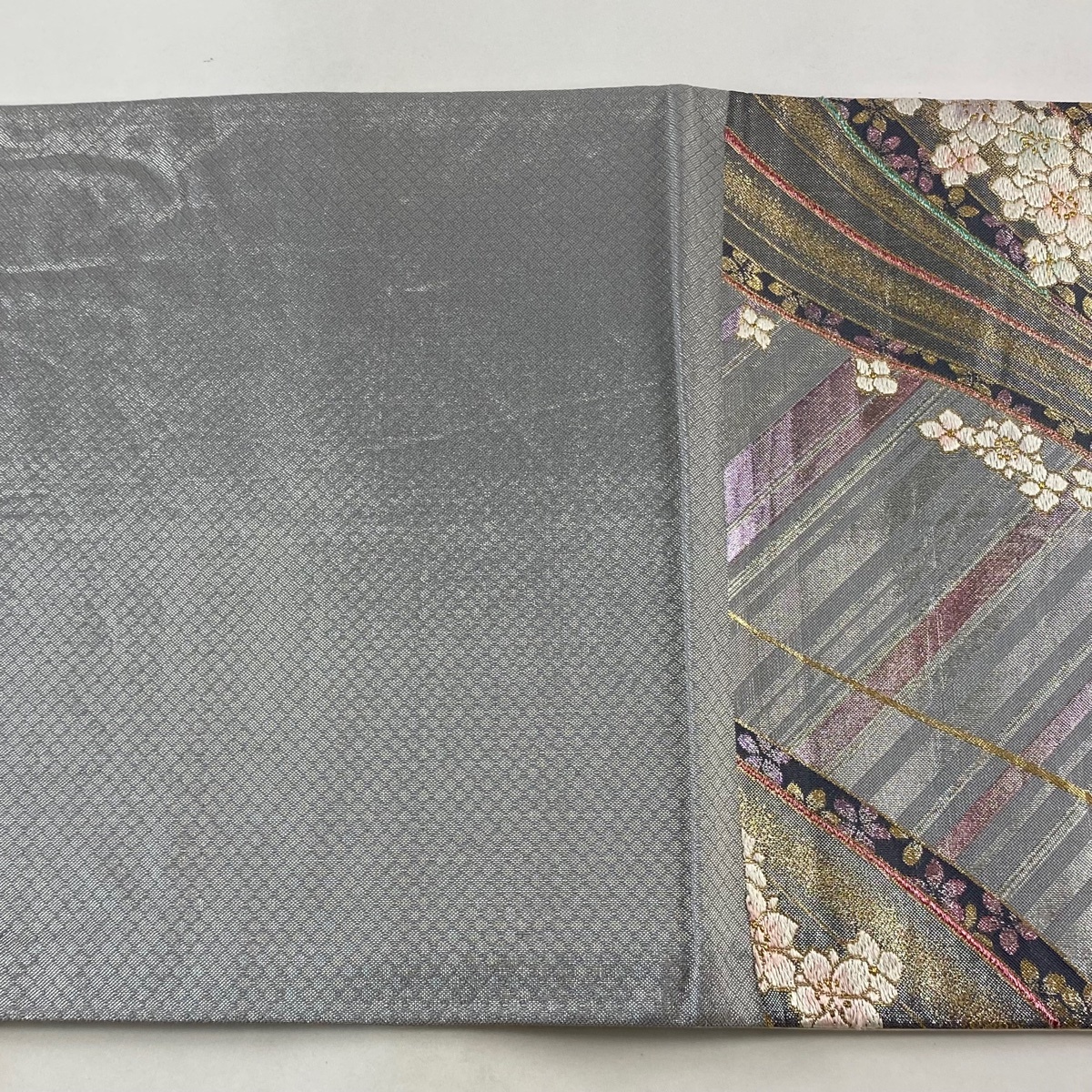 | 袋帯 美品 秀品 鈴乃屋 斜縞 花 箔 唐織 灰色 六通 正絹 【中古】 |