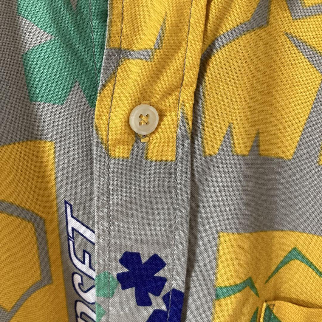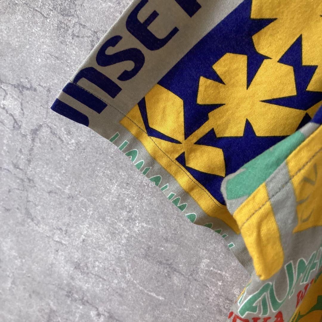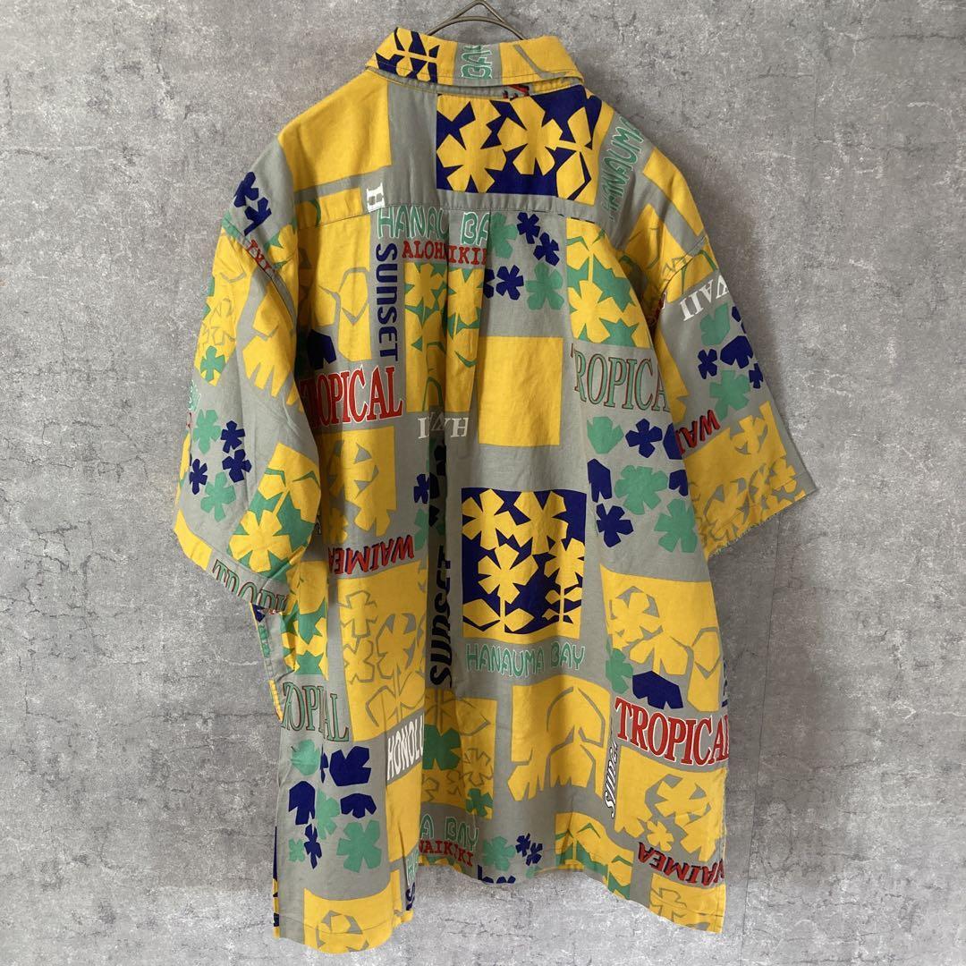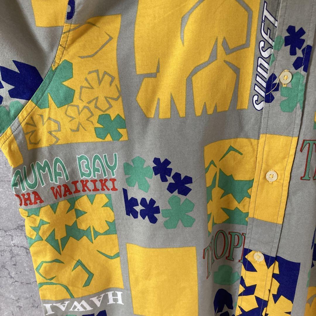 イエロー、グレー、ブルー、グリーンの鮮やかな色合いが目を引く、パッチワーク風の総柄デザインが特徴です。「SUNSET」「ALOHA」「TROPICAL」「HAWAII」といったハワイらしい文字や、プルメリアのような花柄、リーフ柄が組み合わされており、非常にユニークな一着です。