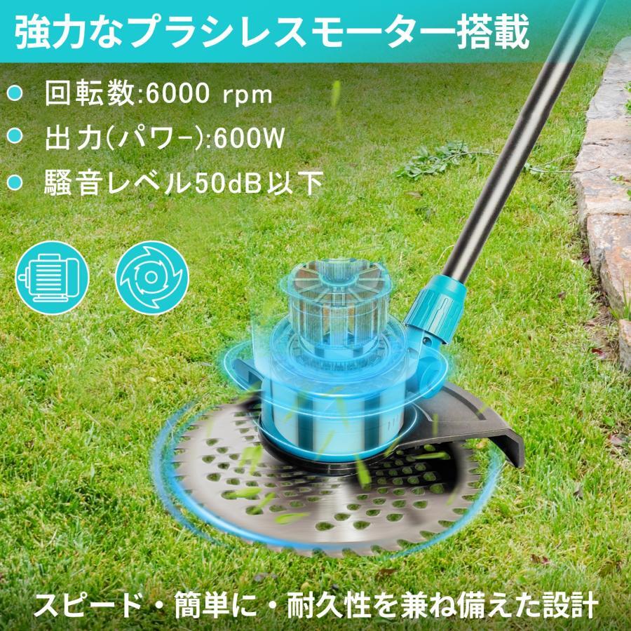 (1)円鋸刃(硬質木や太い枝の剪定)、(2)金属刃(頑丈な雑草・小低木の切断)、(3)ナイロンコードカッター(芝生の端切りなど精密作業)の 3 種類の刃を搭載。充電式芝刈り機として、庭園維持や農地作業など幅広い用途に適しており、灌木の処理から芝生の仕上げ刈りまで、1台で効率よくこなすことができます。