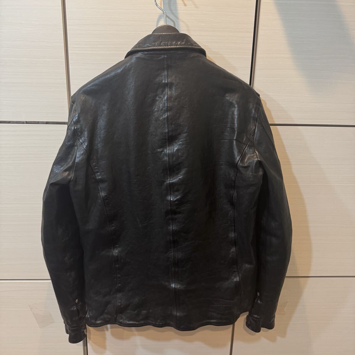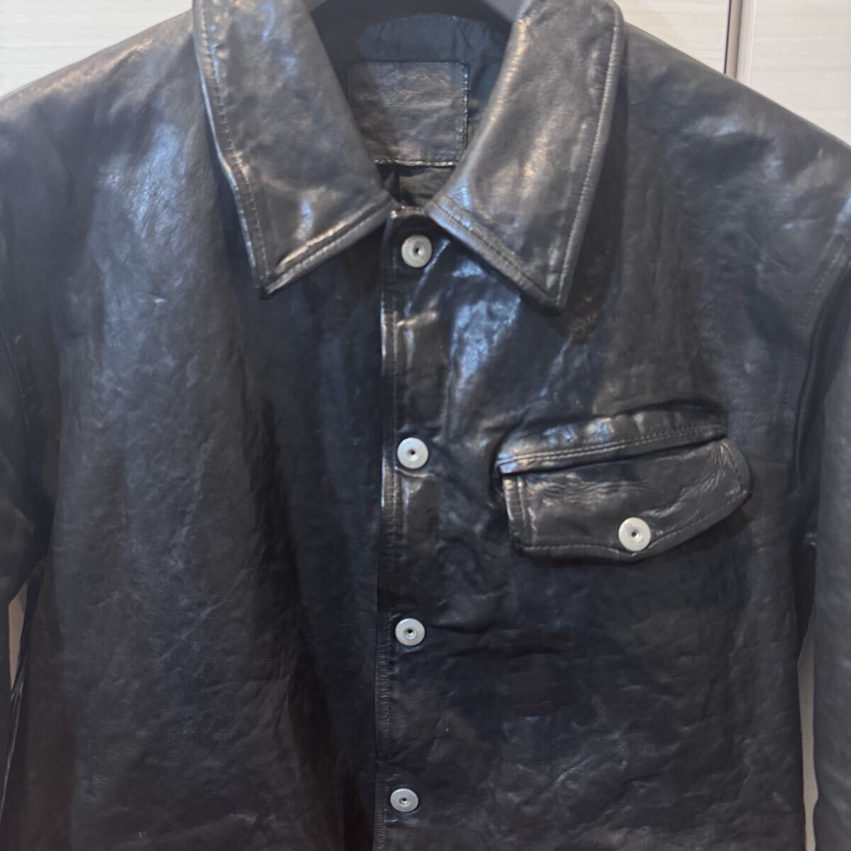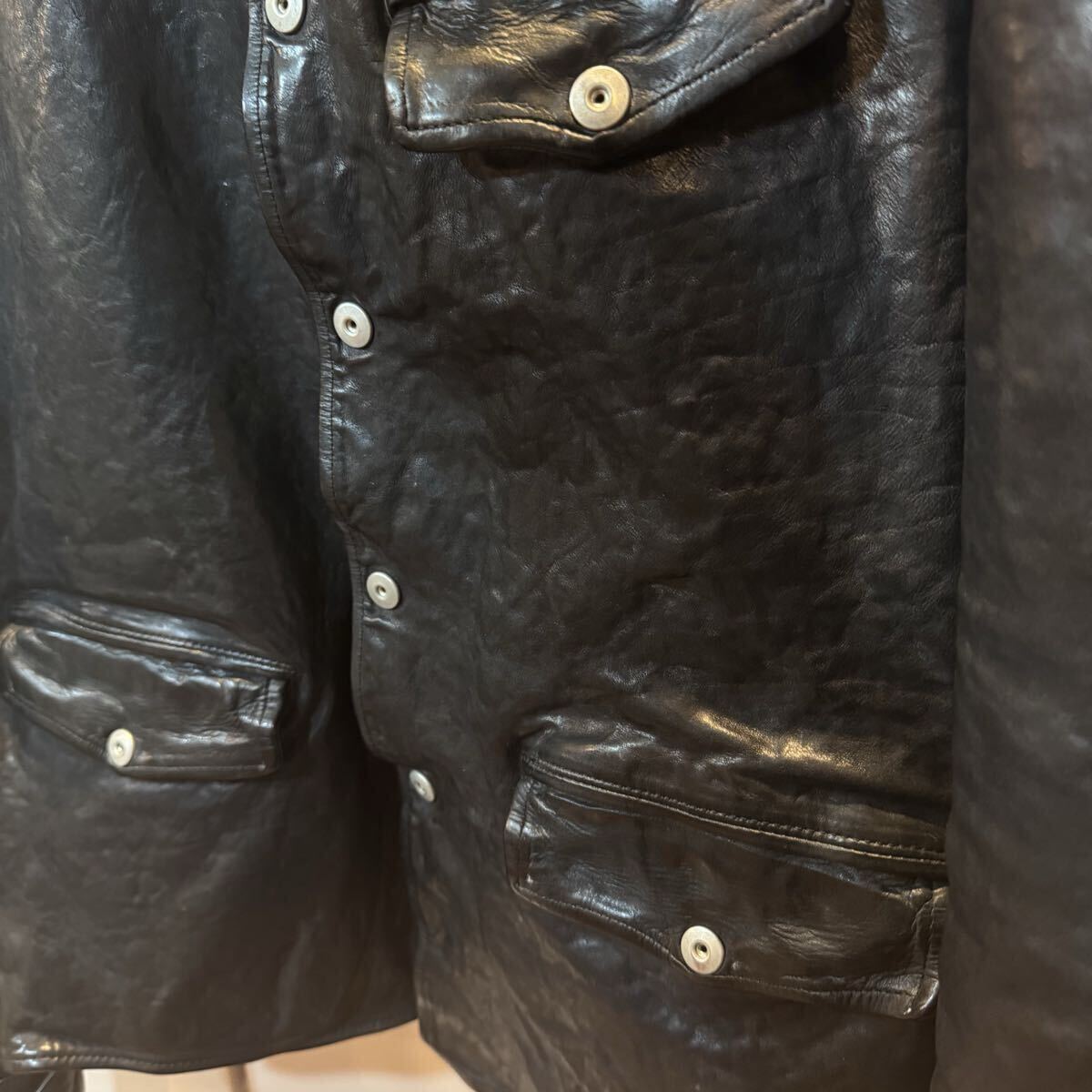 革の表情をストレートに表現した横向きにハギを入れることのないデザイン、フロント/カフスのボタンをドットホックの採用や、腰位置に加えて左胸ポケットに1箇所フラップポケットを配備したブランドオリジナルイメージを表現しています。