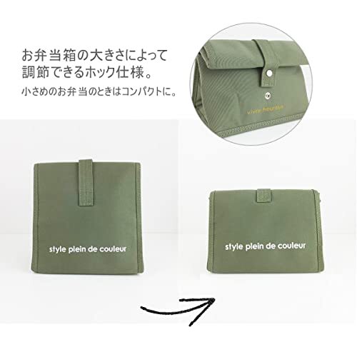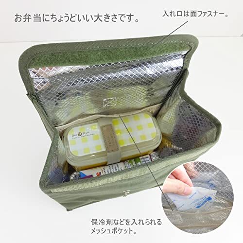 ・開け口は面ファスナー仕様で大きく開き、お弁当の出し入れも楽に出来ます。お弁当の大きさによって調節できる、ホック仕様。小さめのお弁当の時は、ホックで留めてコンパクトに。内側には保冷剤も入れられるメッシュポケットがついています。
