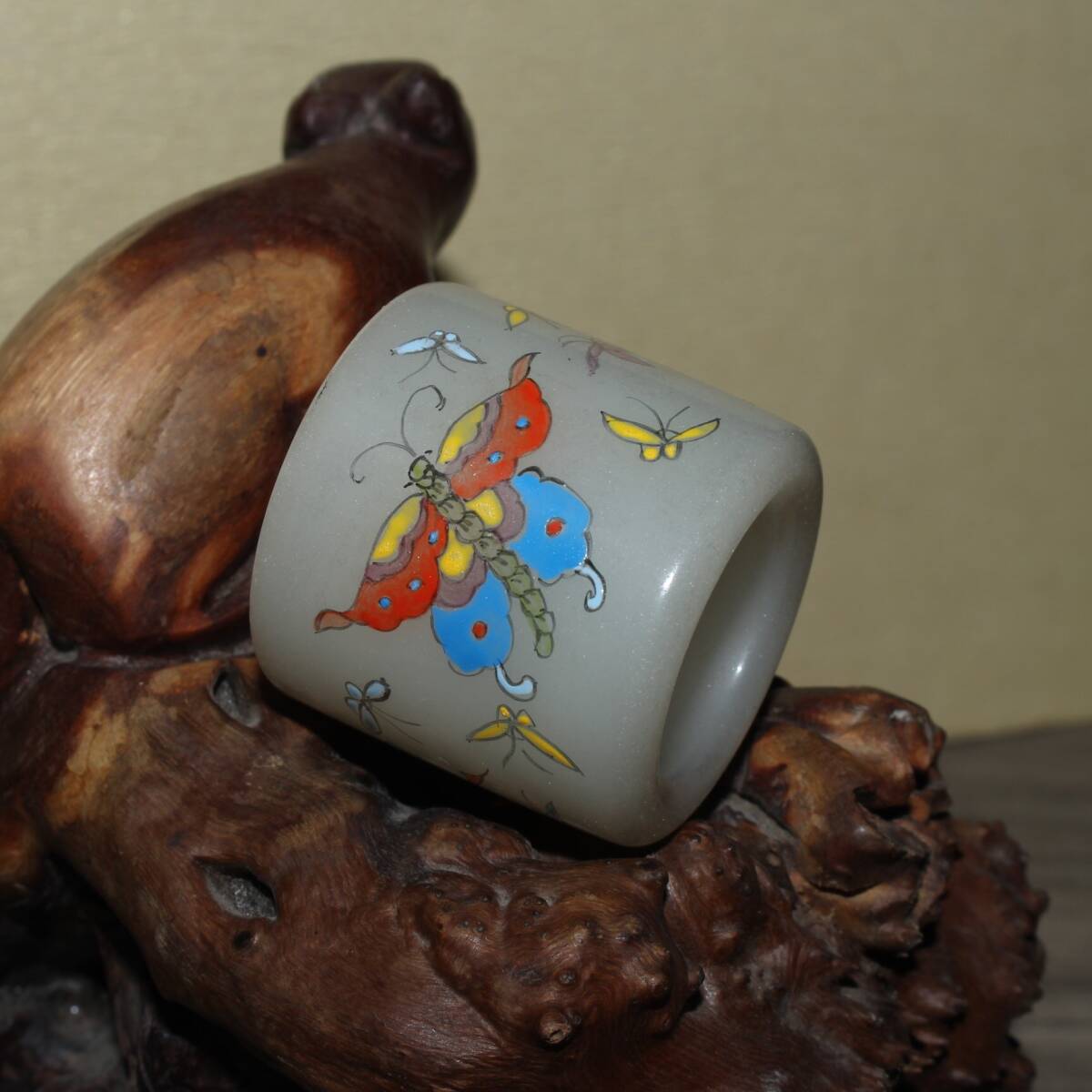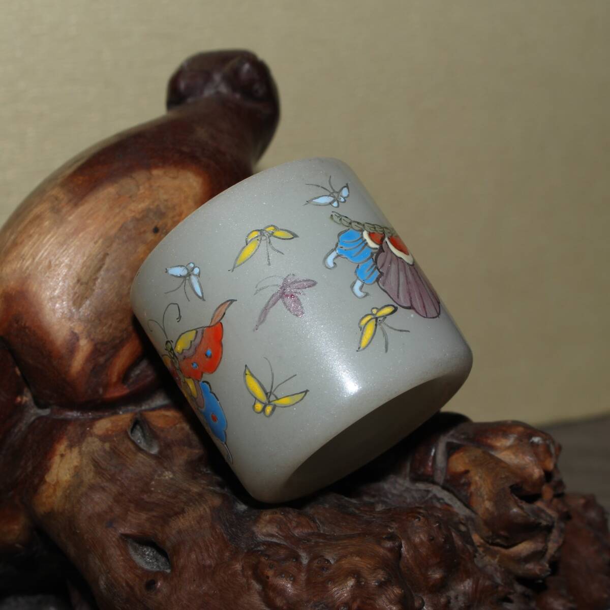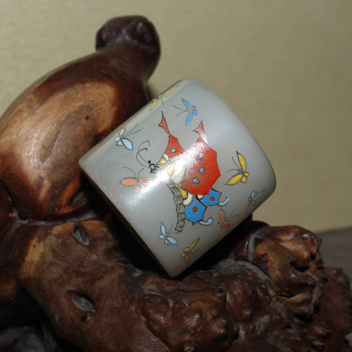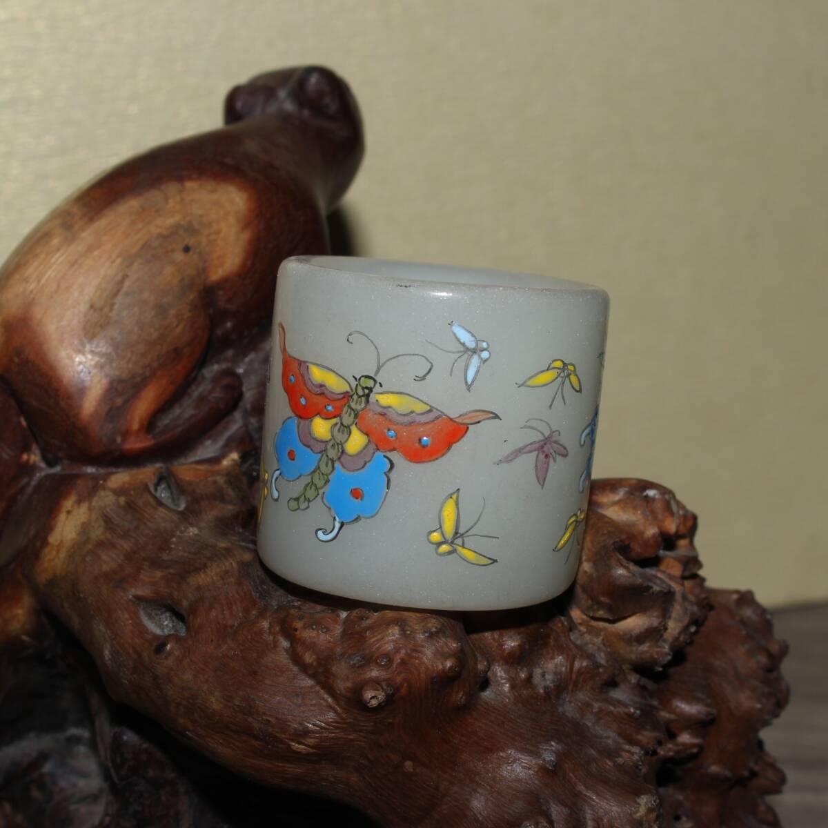【超珍館蔵】琉璃製 細密彫 描金 彩繪 蝴蝶紋 指輪 根付 裝身具 古賞物 古董品 古美術品 時代物 旧家蔵出 稀少珍蔵品