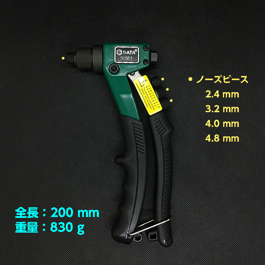 仕様:全長…約200mm、重量…830g、対応リベット径…2.4・3.2・4.0・4.8mm特徴:片側締結のブラインドリベットをかしめるための工具です。ボルトとナットが使えない箇所での締結や、はずす必要のない部位、溶接できない部位の締結ができます。※本商品を複数お求めの際は、『ネジの永井ヤフーショップ 店』よりご購入ください。https://store.shopping.yahoo.co.jp/neji-701/