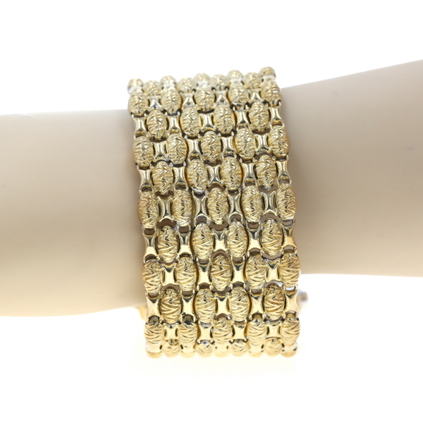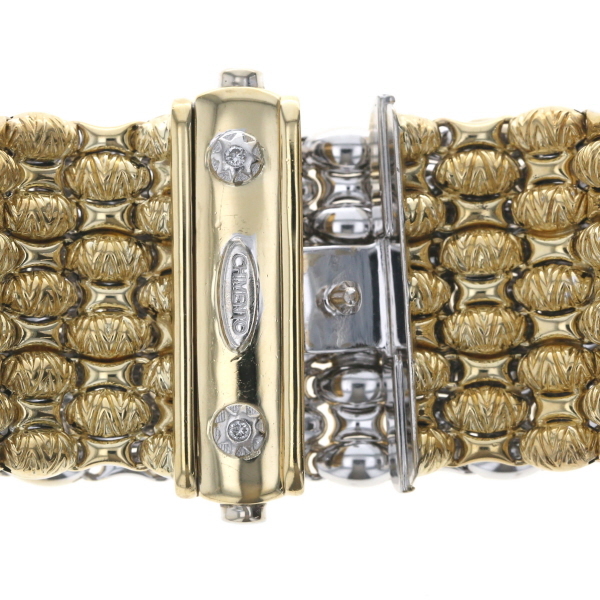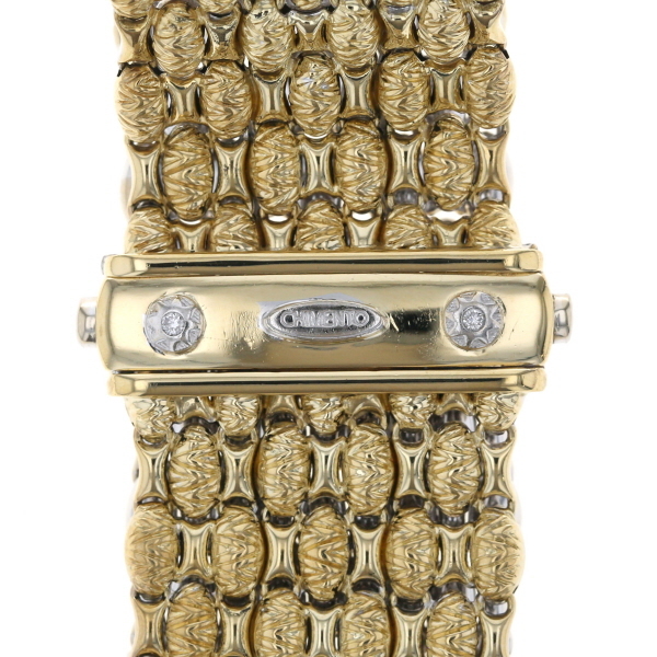 商品紹介 | イタリアのブランド、CHIMENTO【キメント】のブレスレットです。 イエローゴールドとホワイトゴールドのコンビカラーで、幅広で存在感のあるデザインです。 表面には繊細な模様が施されており、裏返すと異なるデザインが現れるリバーシブル仕様になっています。 手元を華やかに演出する、上品なアイテムです。 |
