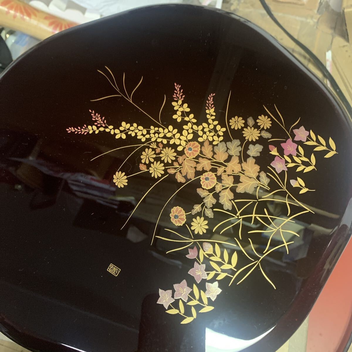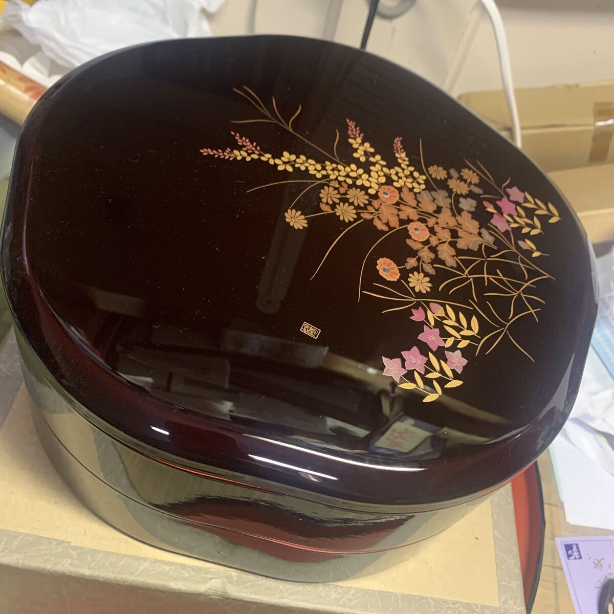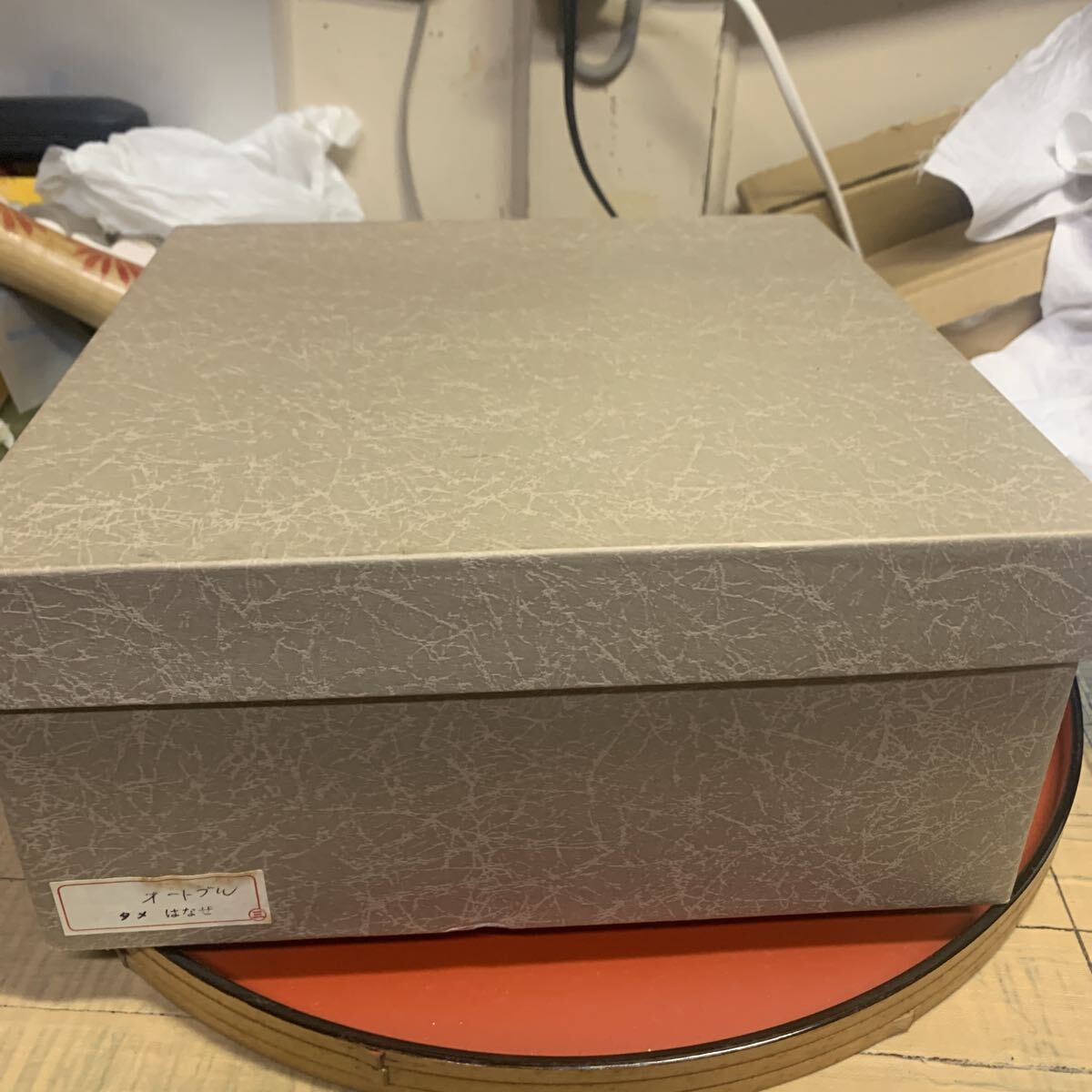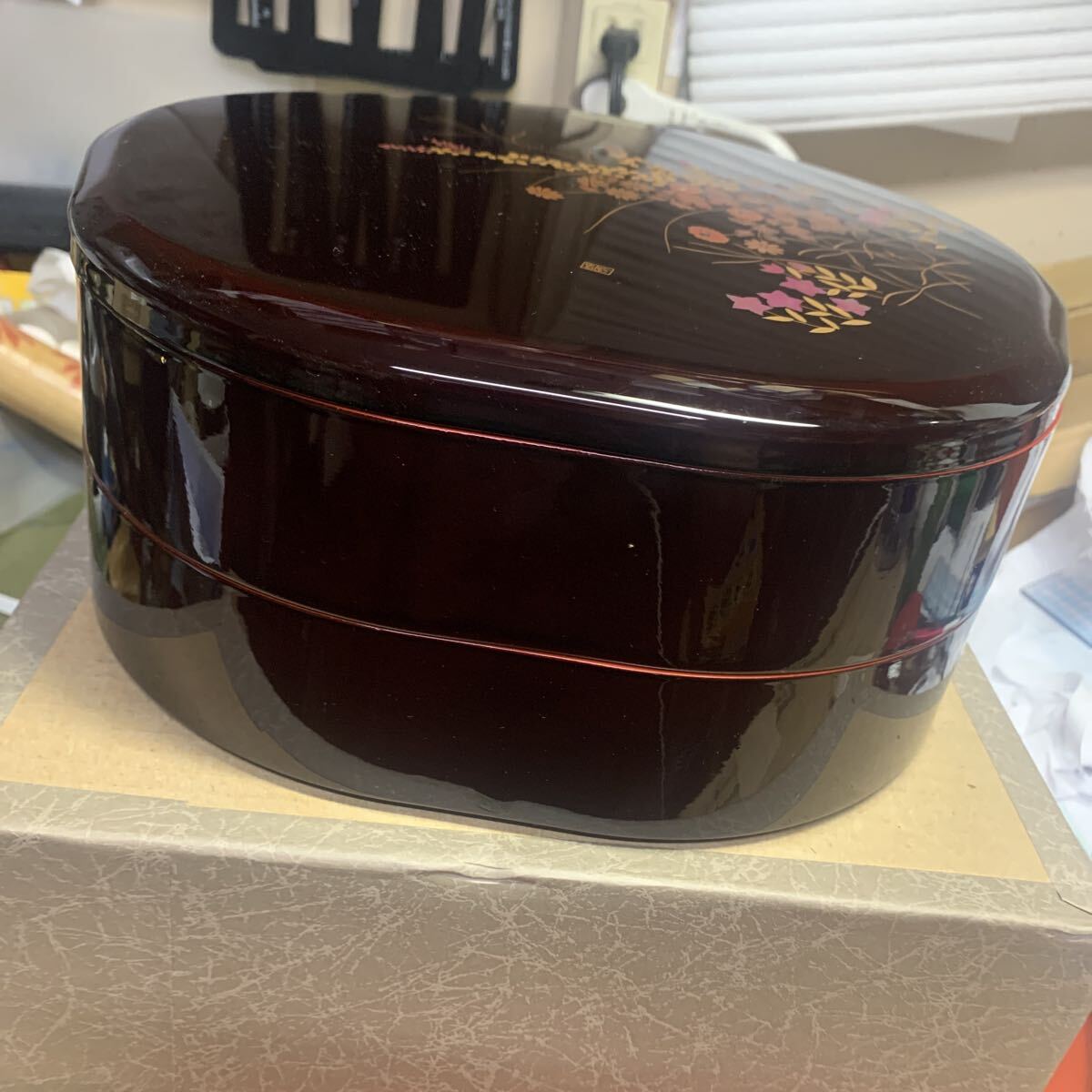 縦横約25センチ、高さ2段重ね約11.5センチ、1段は区切りの皿が入っております。樹脂製です。ノークレームノーリターンでお願いします。運賃を80サイズに収めるため、外箱にテープを貼っての発送となります。