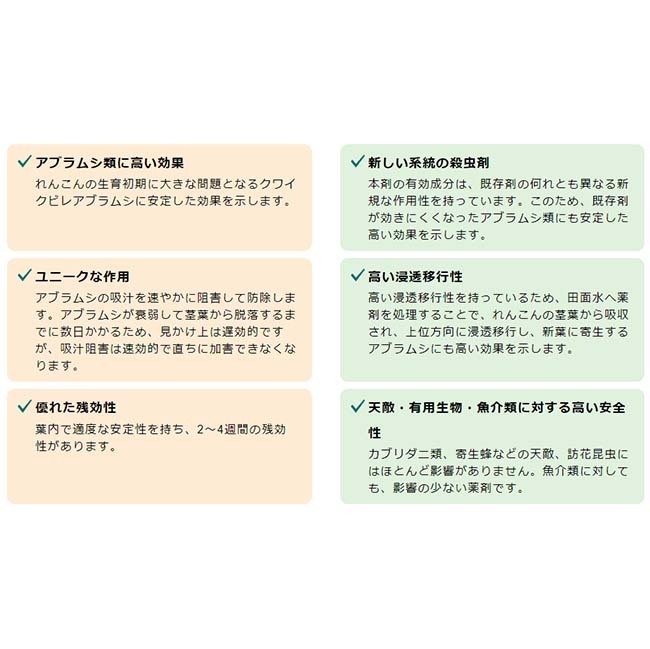 ・れんこんの生育初期に大きな問題となるクワイクビレアブラムシに安定した効果を示します。