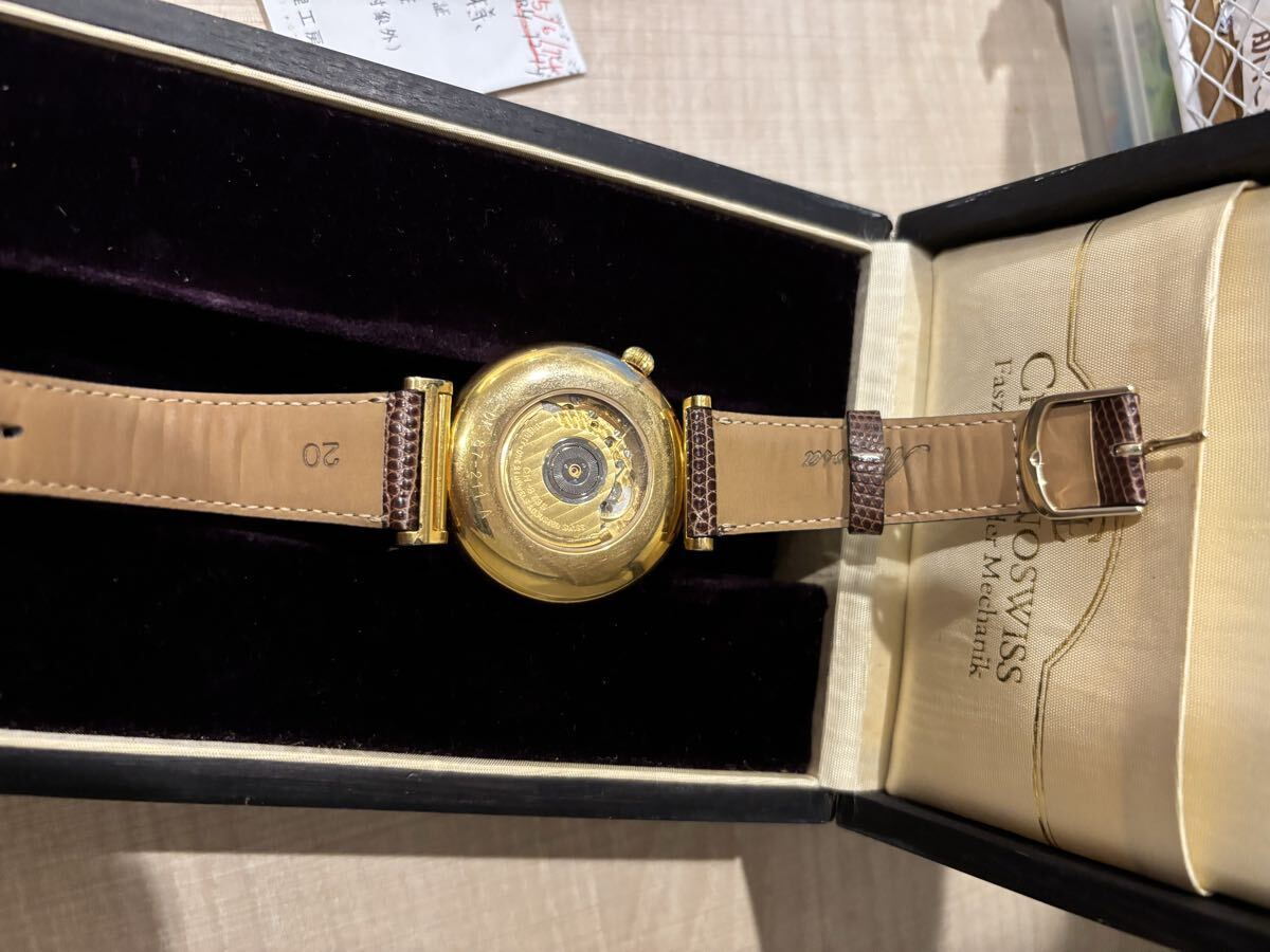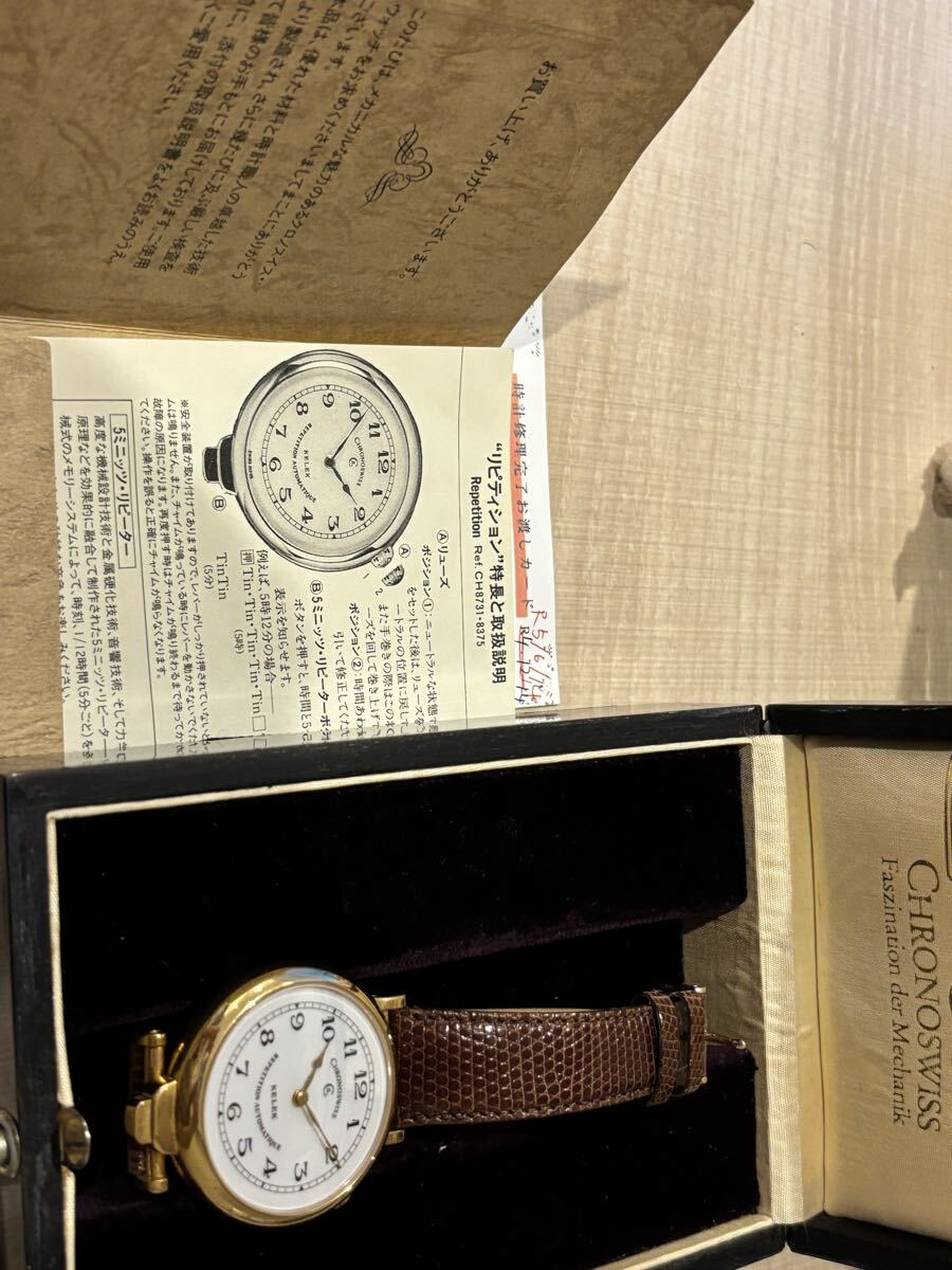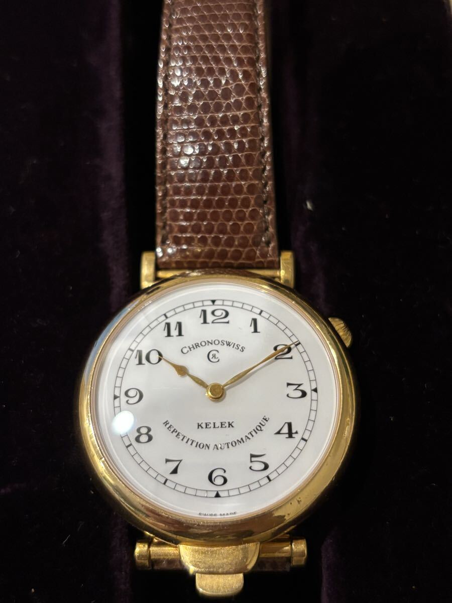 クロノスイスとケレック(現在はブライトリングに買収されています)のダブルネーム、repetitionの出品です。kelekの単独の銘や、その他販売会社等の銘を入れているものはちらほらありますが、クロノスイスとのダブルネームは数少ないです。また、取扱説明書や内箱が残っているのも相当に貴重かと思います。