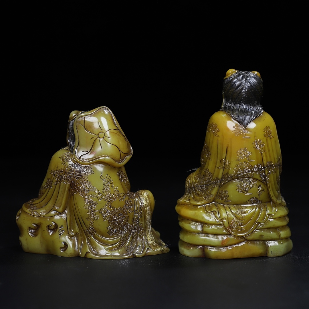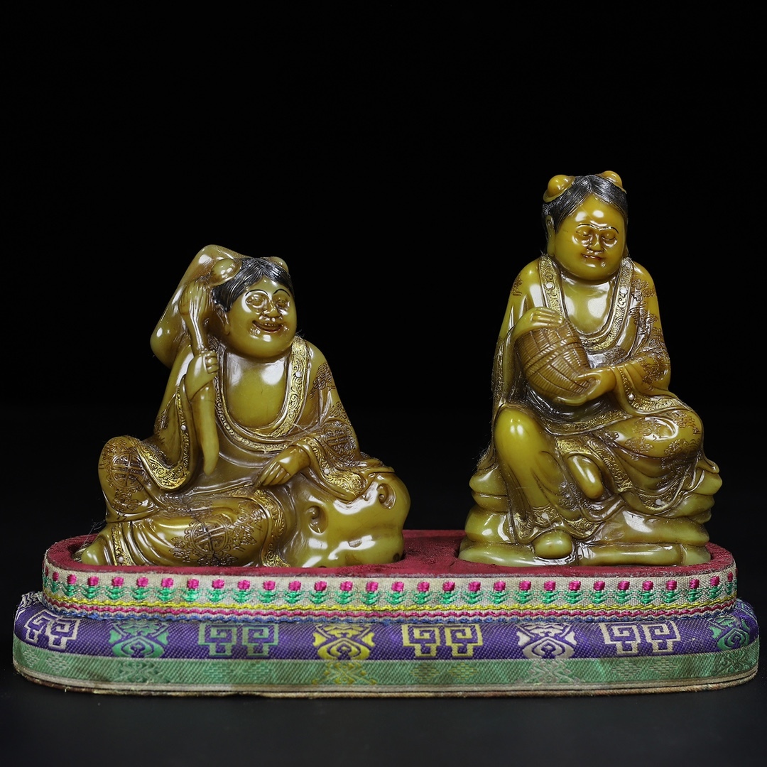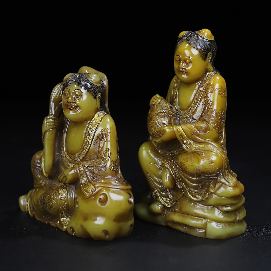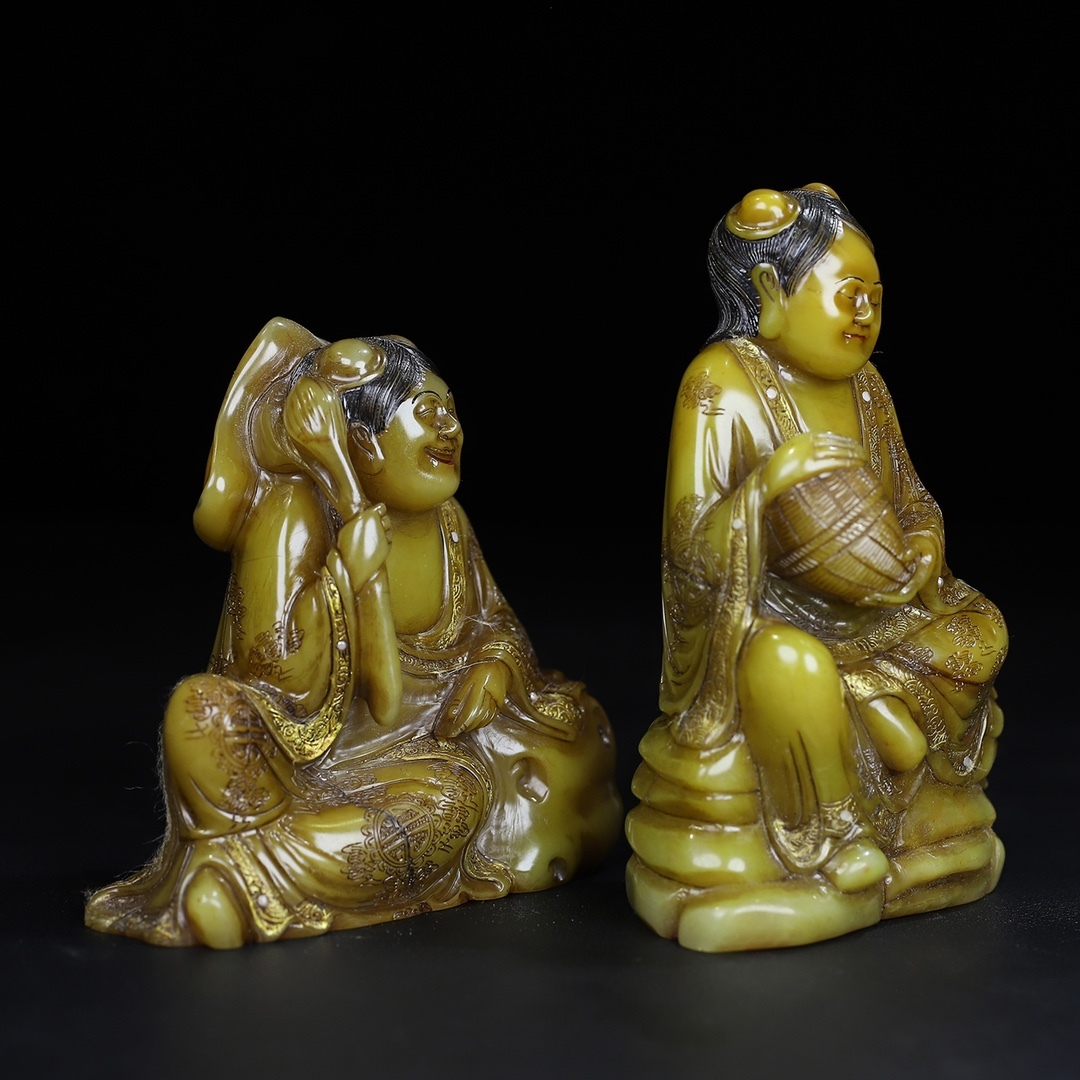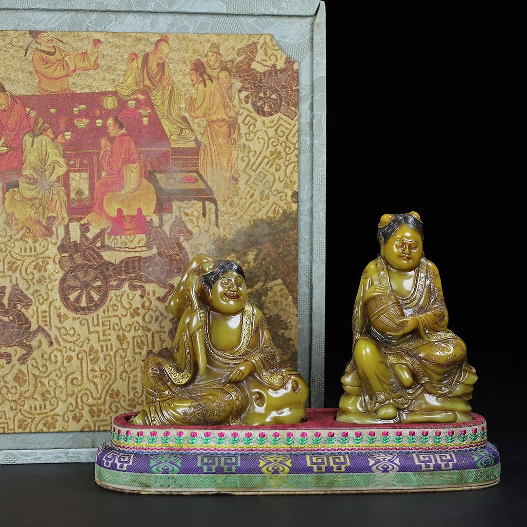 旧蔵 清 寿山石 『和合二仙』 民間愛神 印鑑 置物セット 天然石 手彫 篆刻 極細工 中国古玩 骨董品 古美味 208