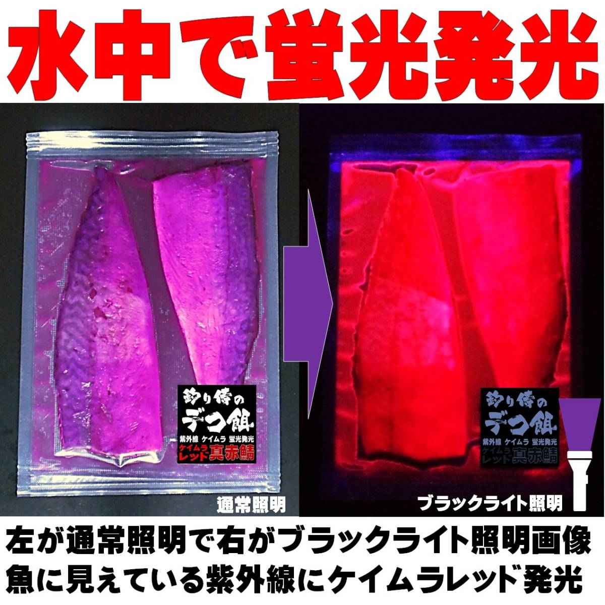 紫外線ケイムラ蛍光発光する鯖エサです。特殊な赤色の蛍光加工液に漬け込んでいるので鯖の色は真赤に染まっています。ブラックライト画像でご確認いただけますが、紫外線に赤色に蛍光発光して魚を誘います。