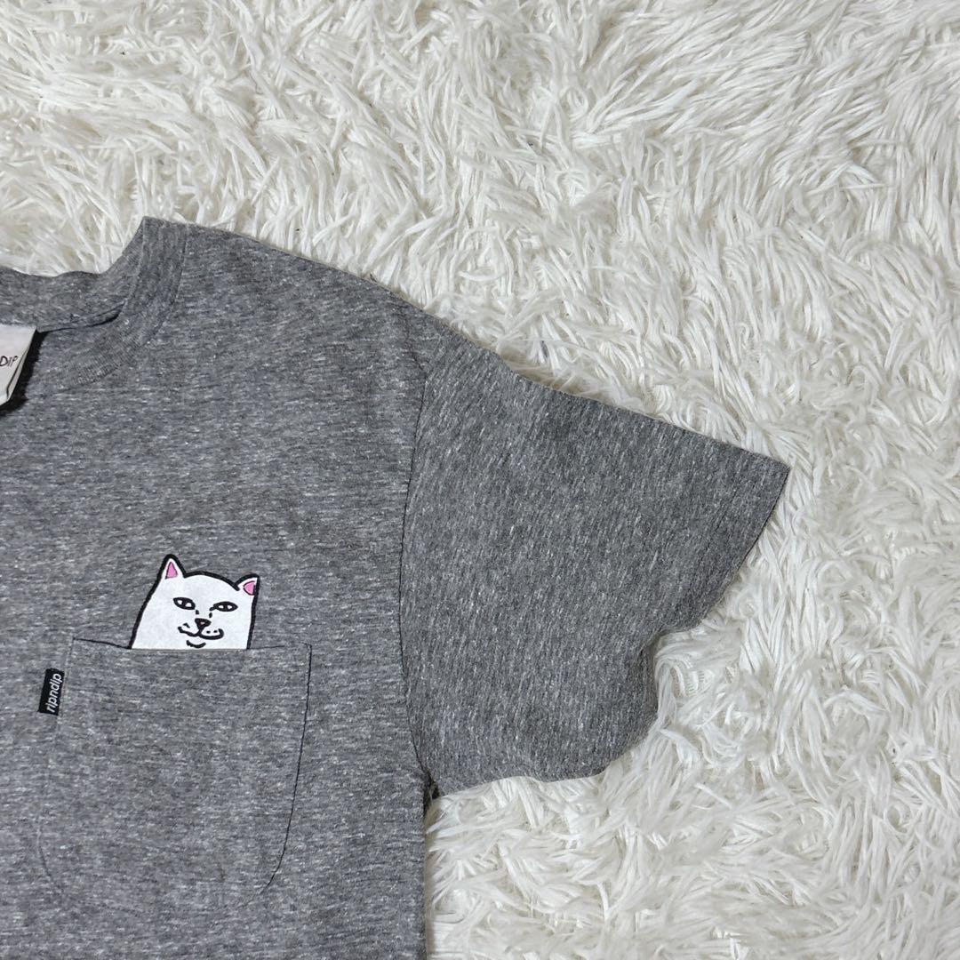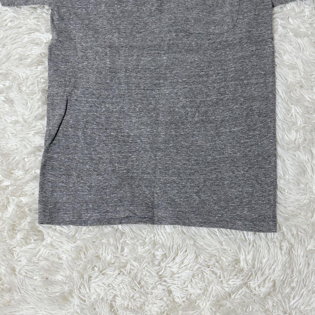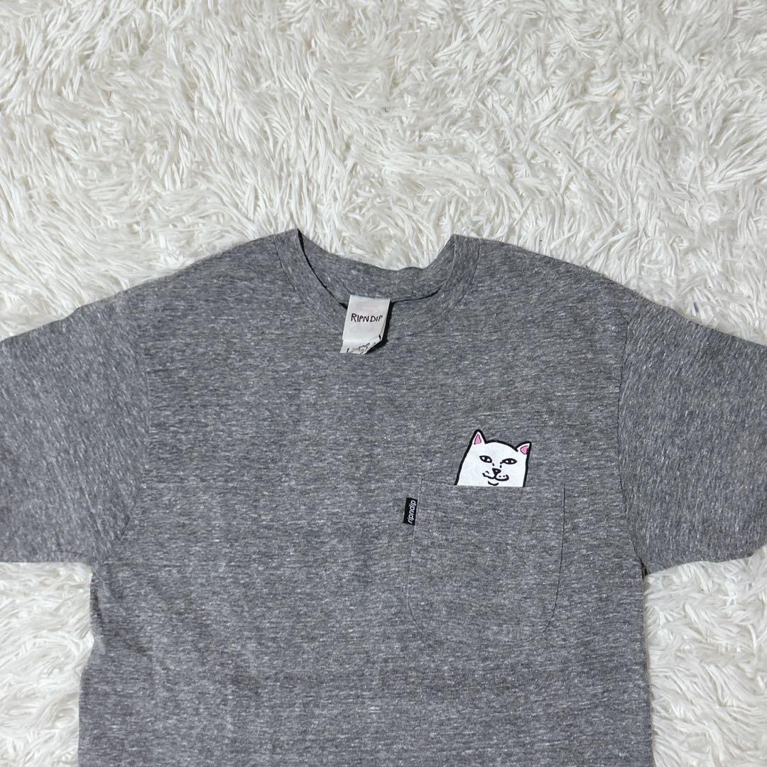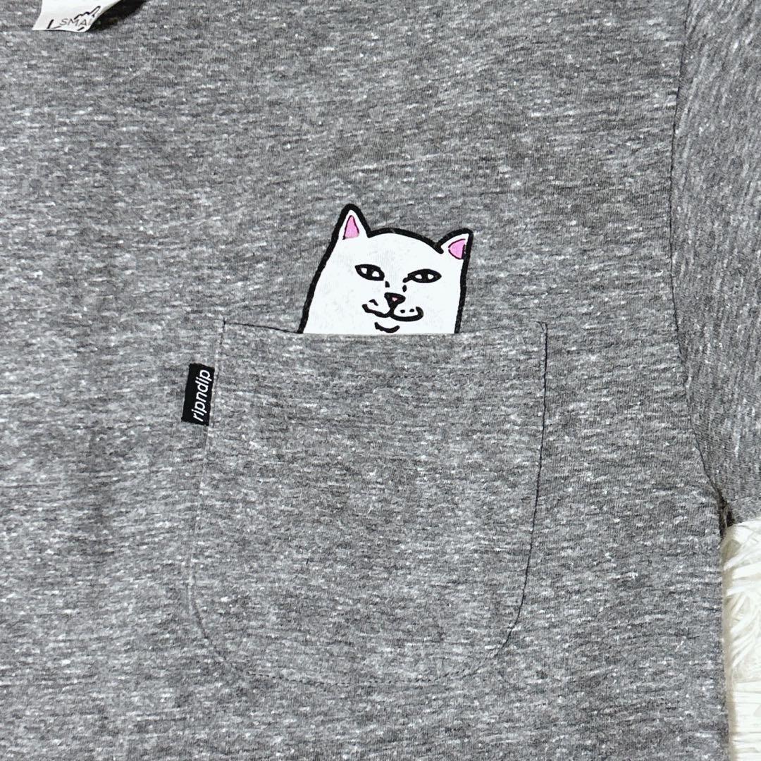 猫のポケットプリントが特徴のグレーの半袖Tシャツ。