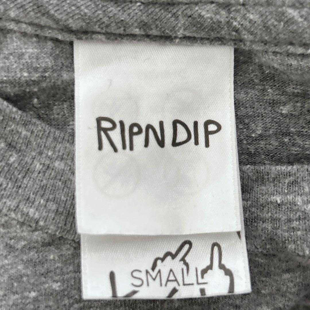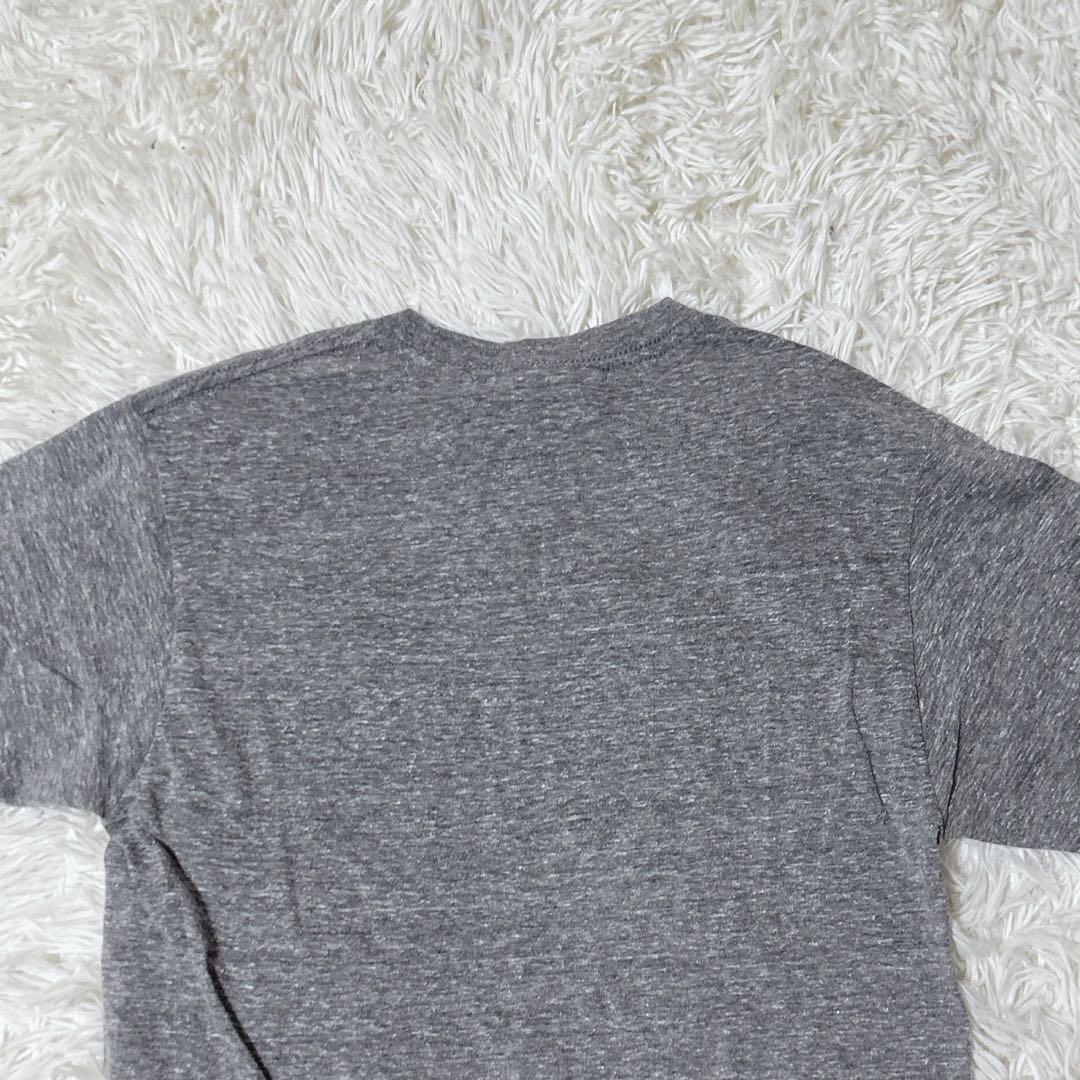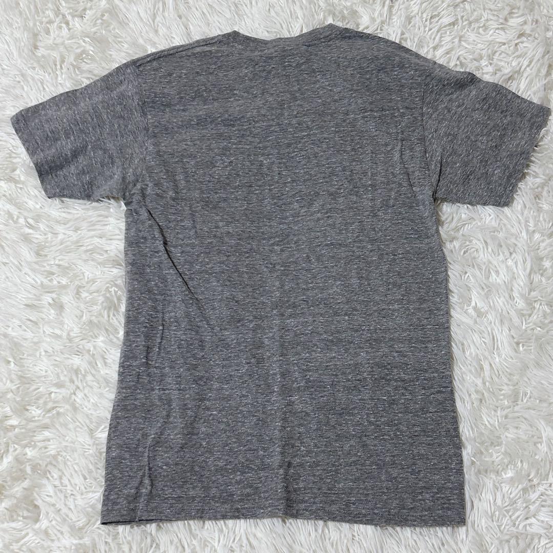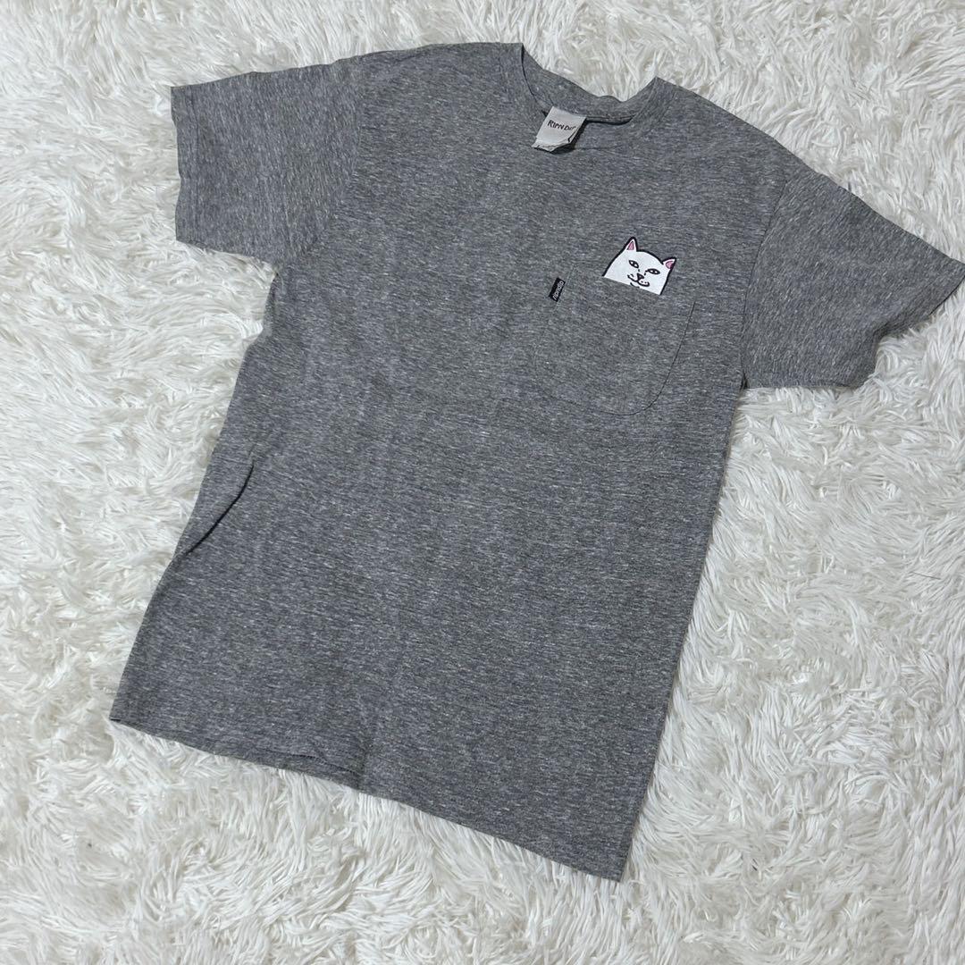 猫のポケットプリントが特徴のグレーの半袖Tシャツ。