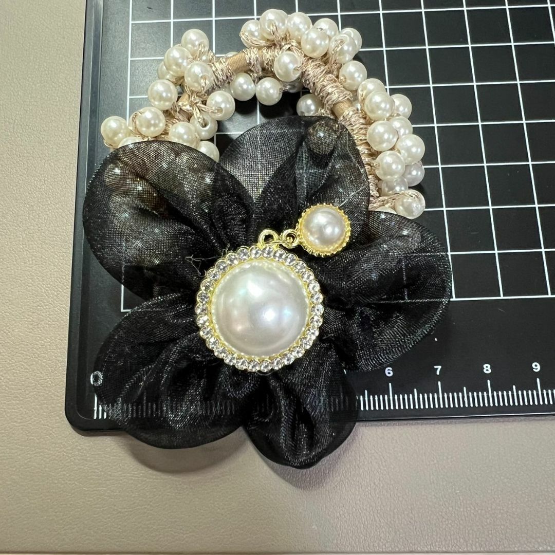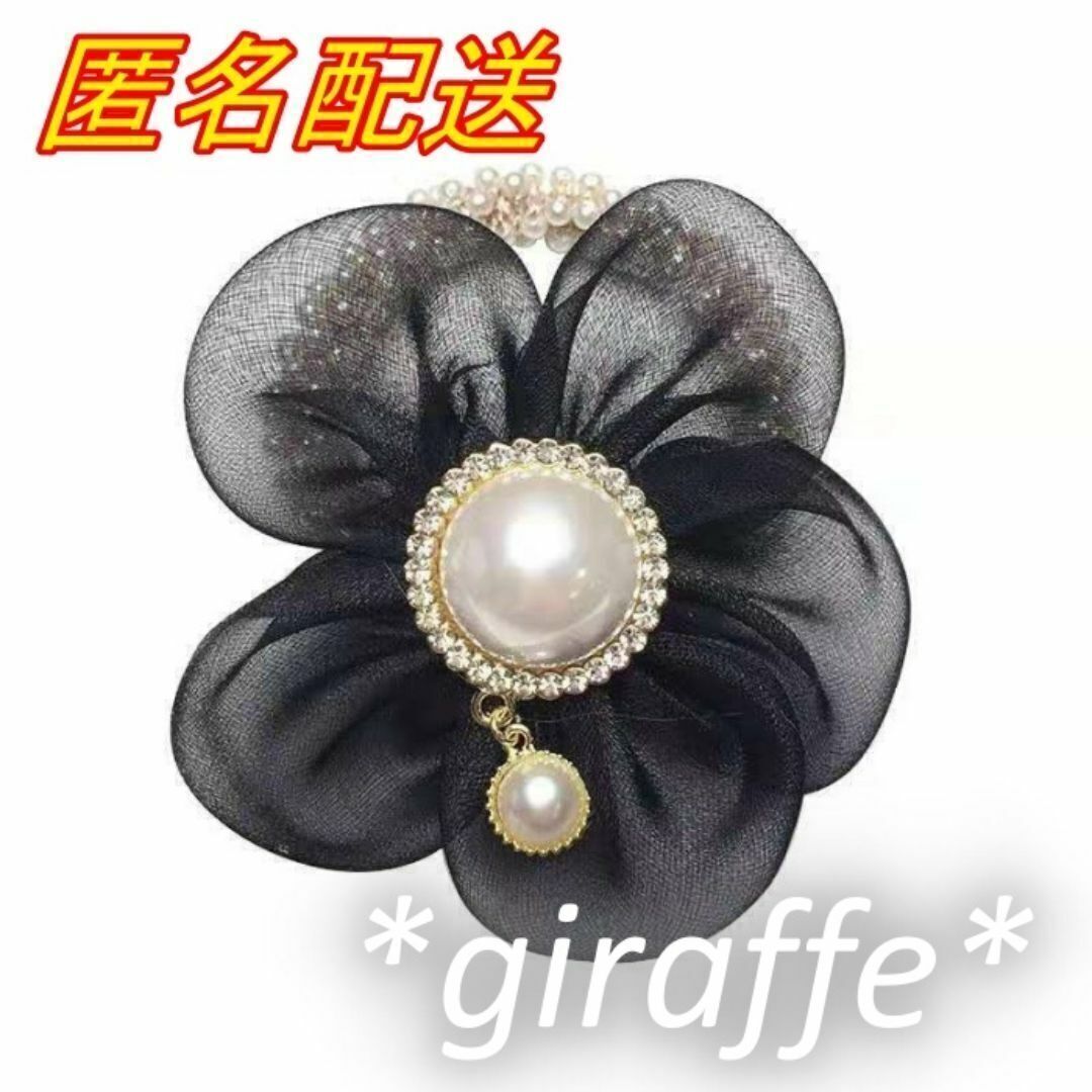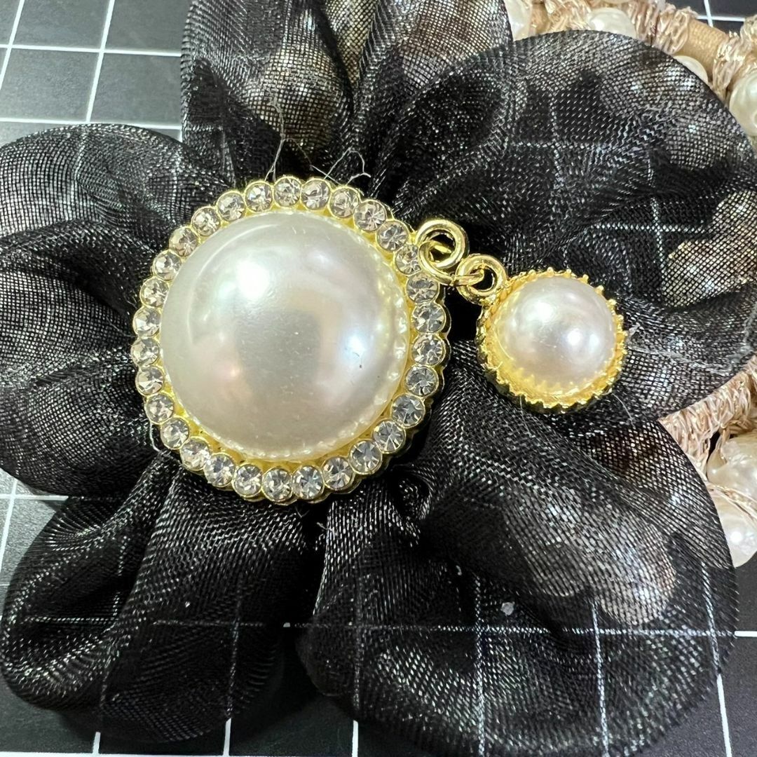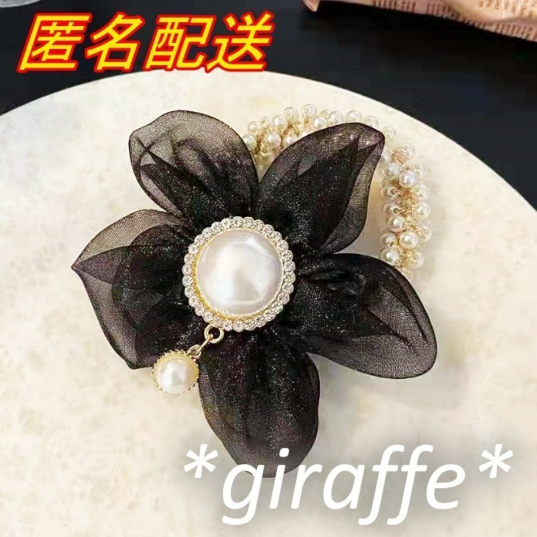 E453 匿名配送 ヘアゴム シフォン フラワー 花 ブラック パール 髪ゴム ヘアアクセサリー シュシュ