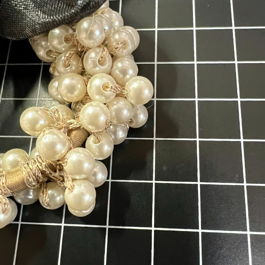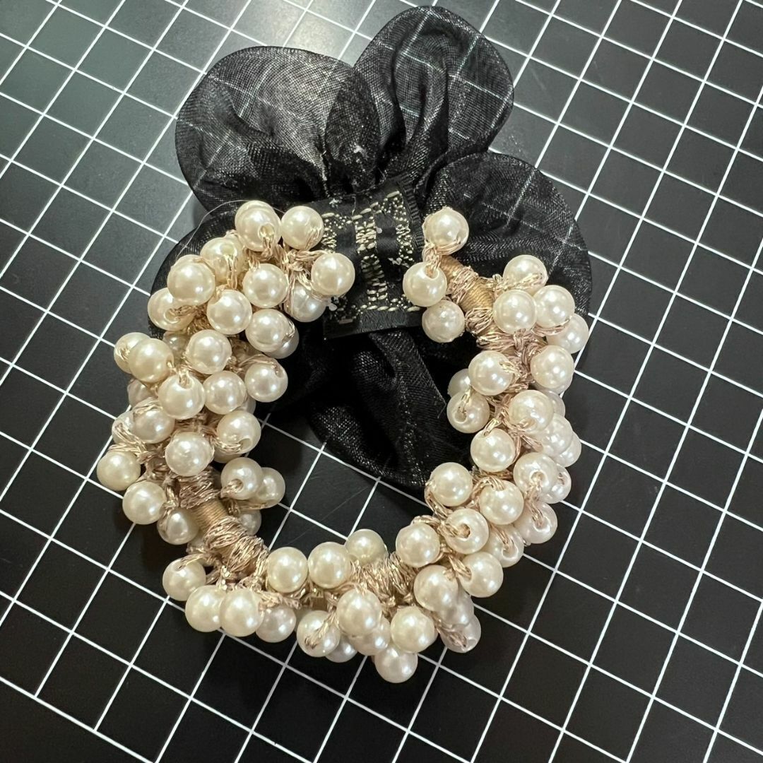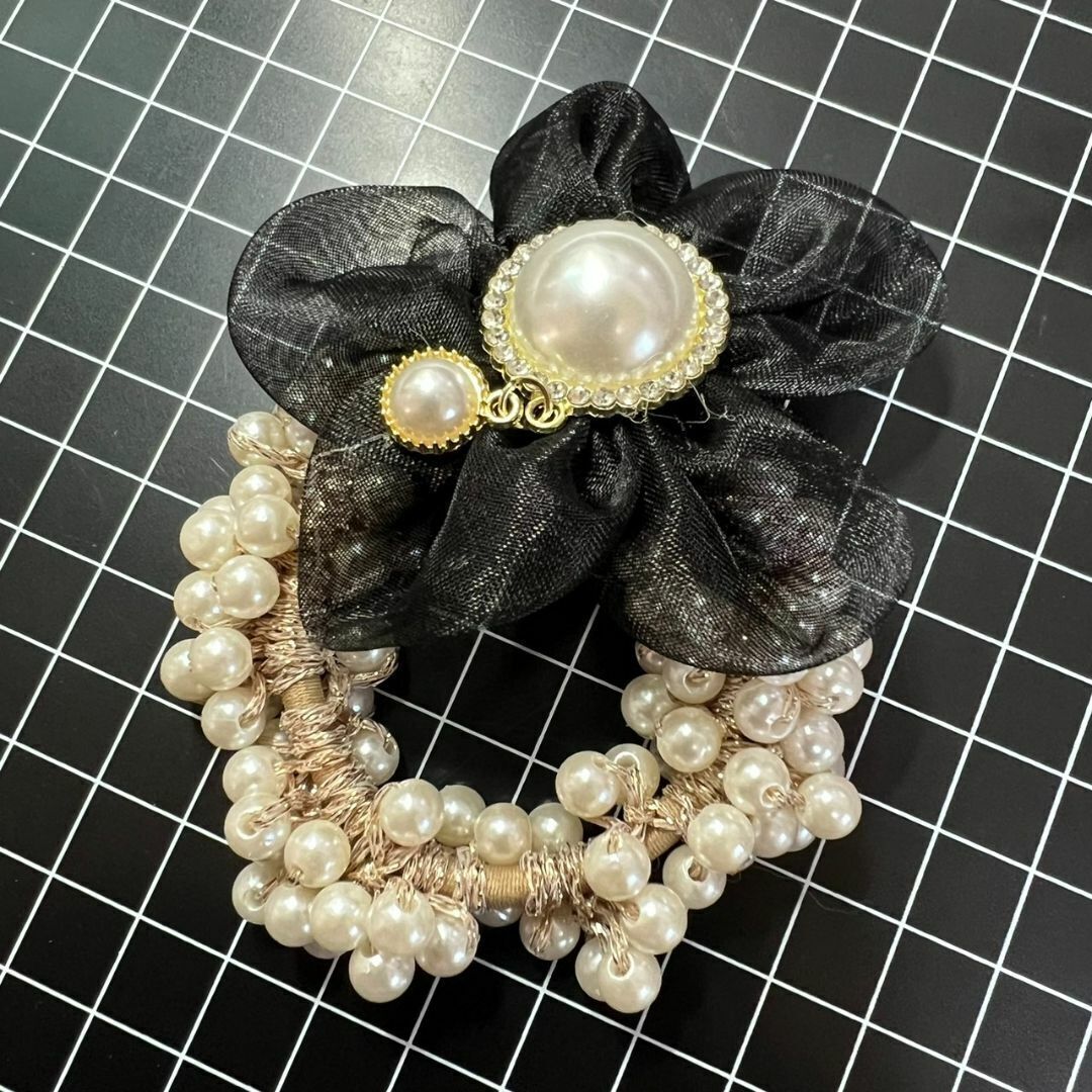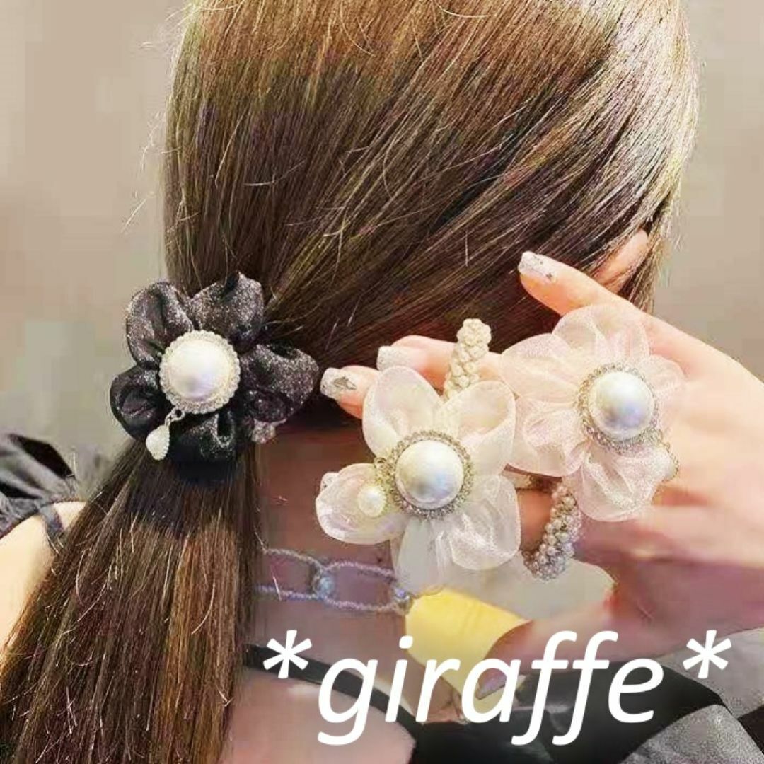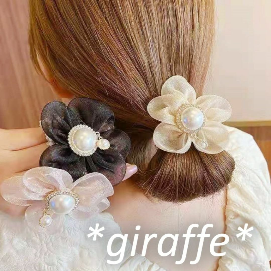 E453 匿名配送 ヘアゴム シフォン フラワー 花 ブラック パール 髪ゴム ヘアアクセサリー シュシュ