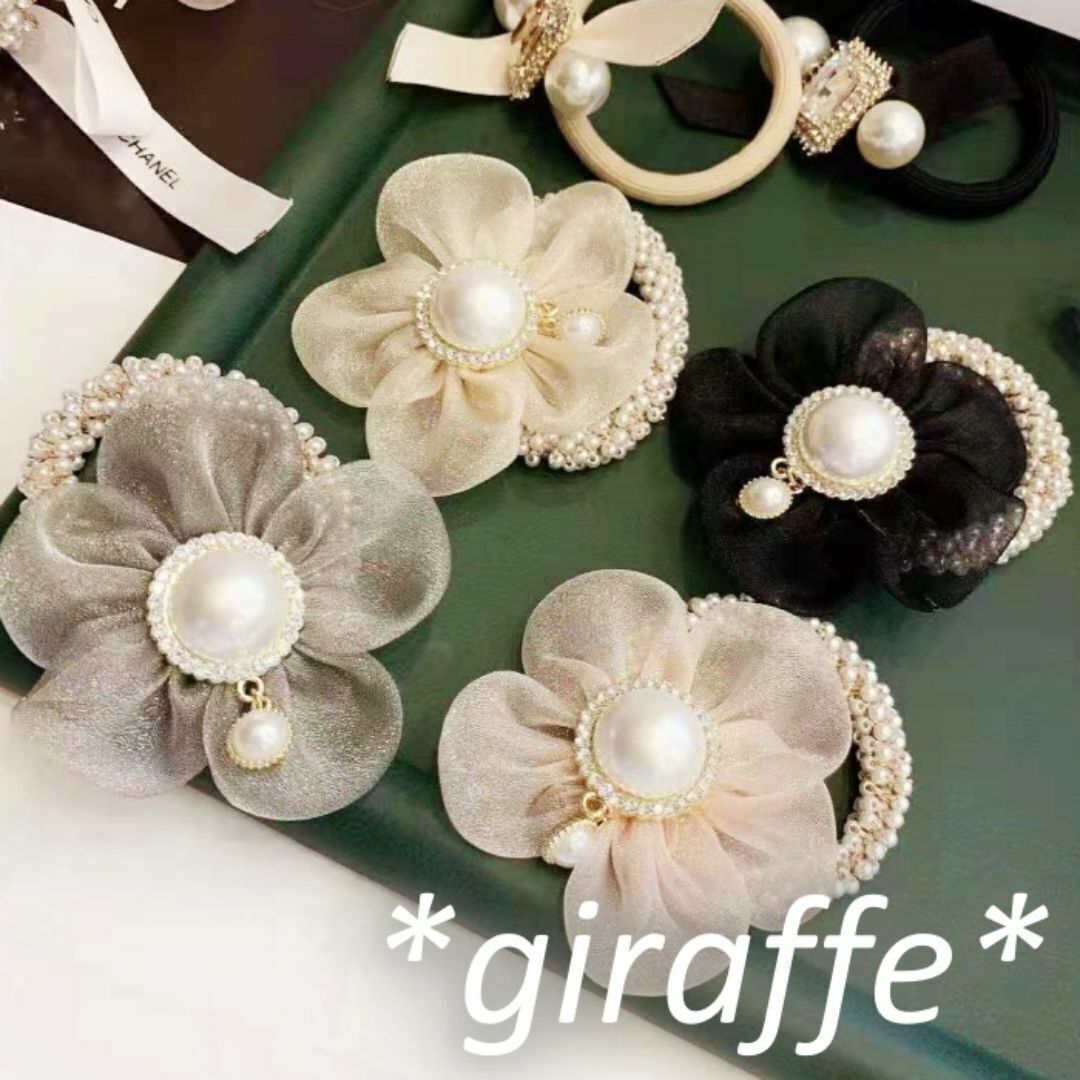 透け感のあるシフォンのフラワーデザインが可愛らしいヘアゴムです。