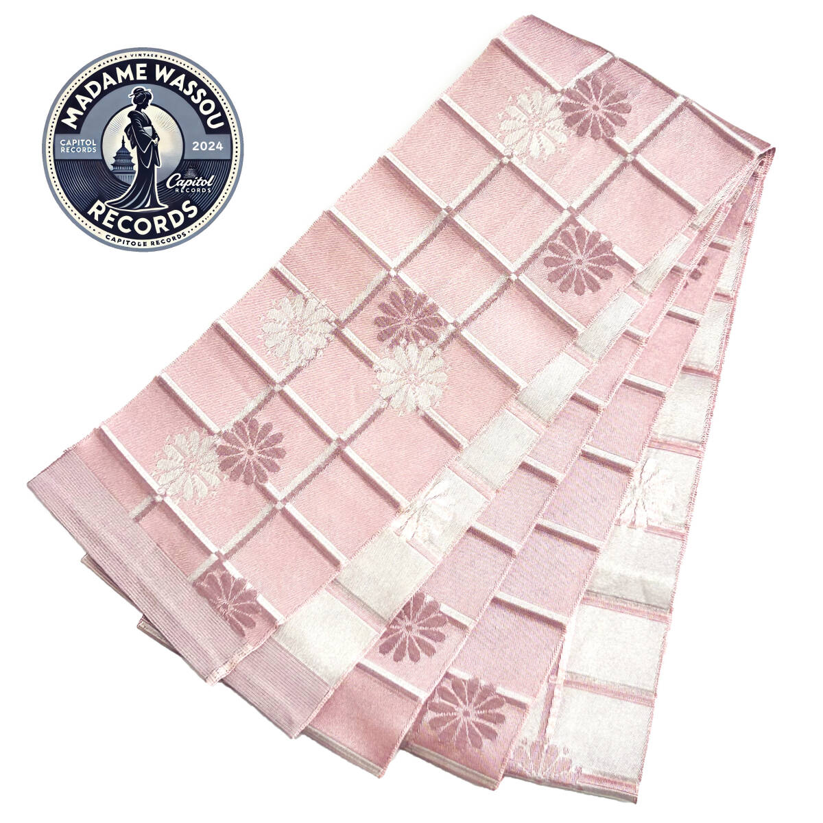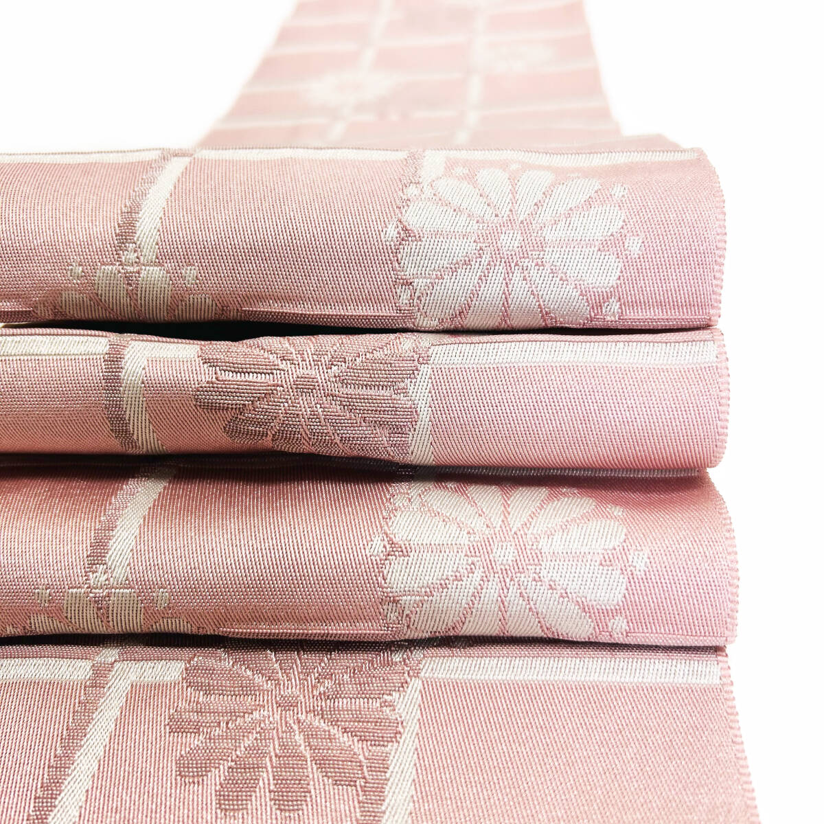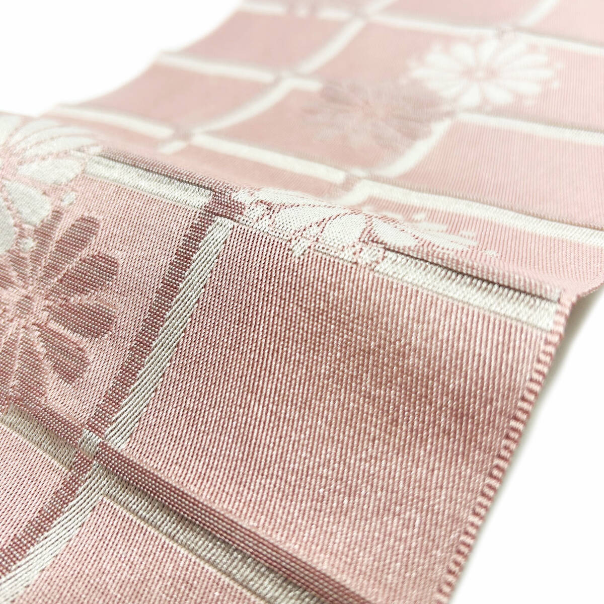 明るく綺麗なパステルピンクの地に、格子模様その中に菊が織り出された可愛い色合いの半幅帯になります。