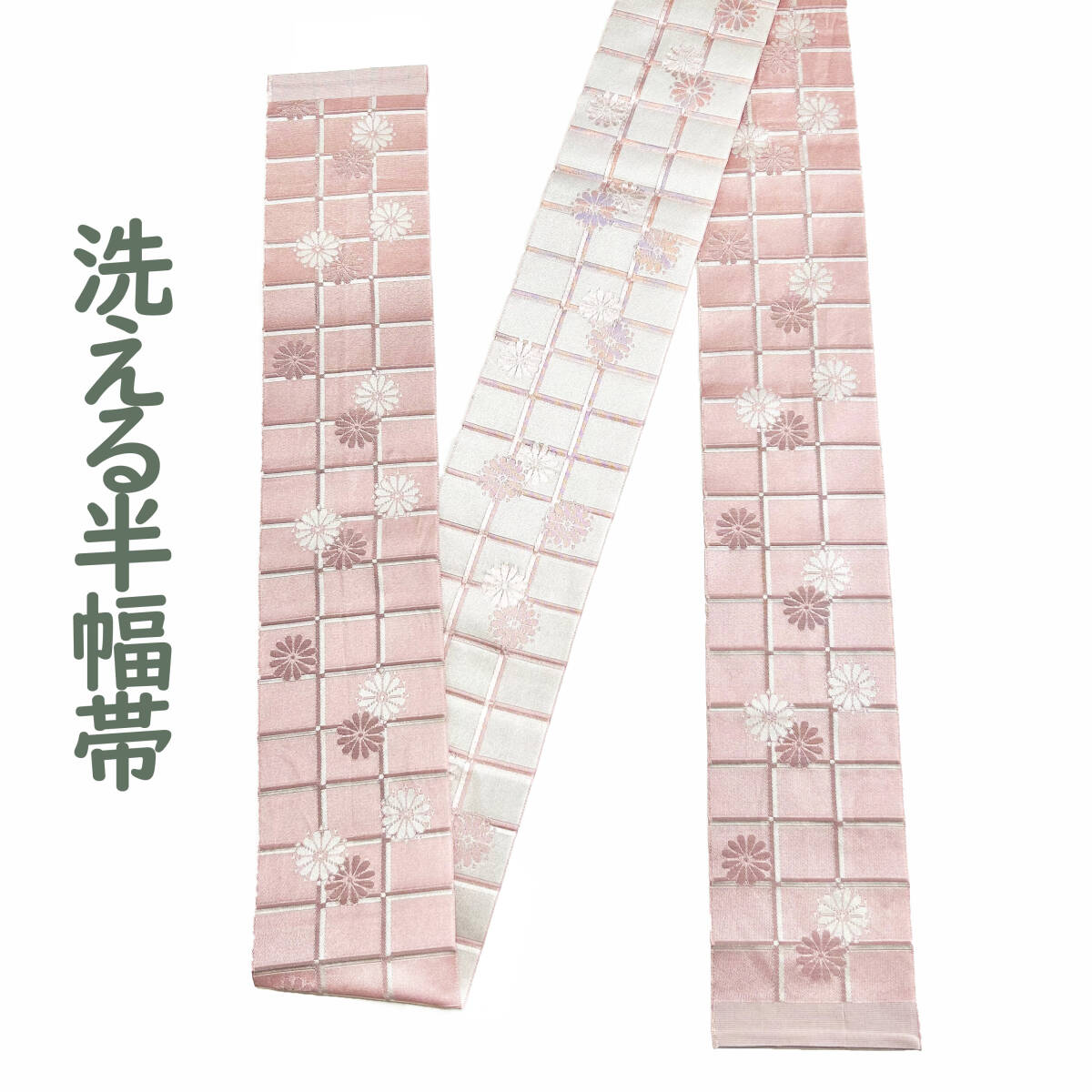 ★半幅帯 半巾帯 全通柄 洗える 格子 菊 パステルピンク カジュアル ポリエステル 仕立て上がり 送料無料★
