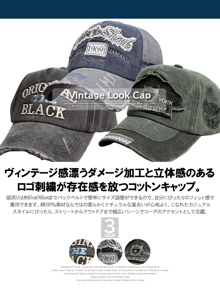 商品説明 | ヴィンテージ感漂うダメージ加工と立体感のあるロゴ刺繍が存在感を放つコットンキャップ。 |