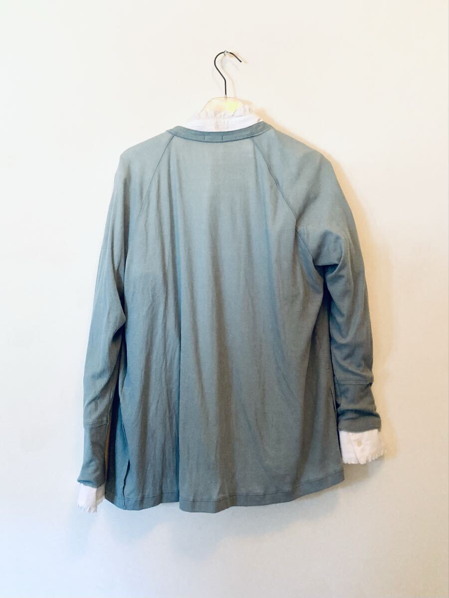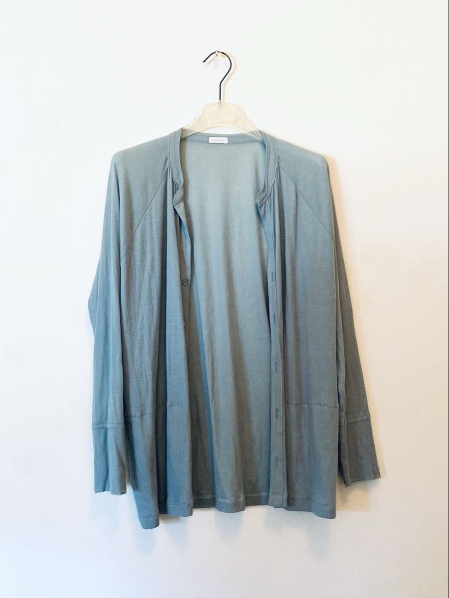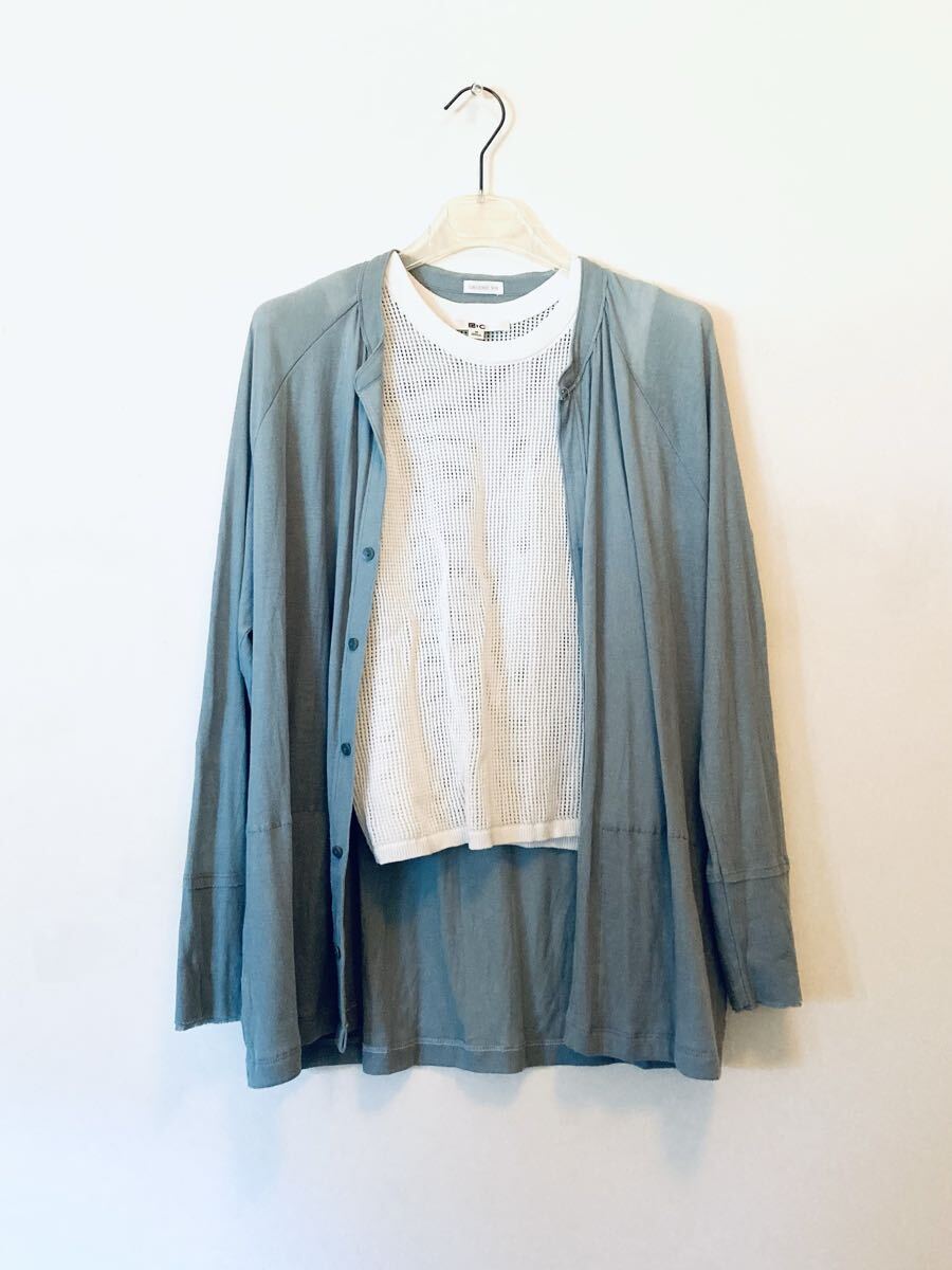 GALRIE VIEの肌触りの良いコットンジャージーカーディガン。伸びが良くうっすらと透け感。パンツにもスカートにもワンピースにも合わせやすい。袖先(切りっぱなし) とポケットのみ二枚仕立て。軽くかさばらないので、羽織るだけでなく、肩や腰に巻いても大人のこなれ感が出て素敵。色は綺麗なペパーミントグリーン。試着程度の美品です。