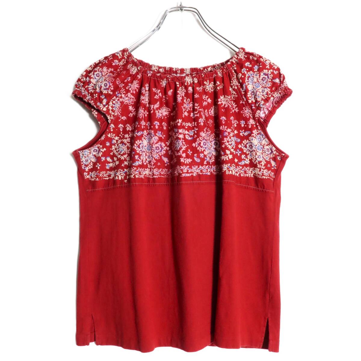 商品説明 | 【実寸約】バスト96着丈54(cm) 【サイズ表記】 L 【素材】 綿100% 【状態】普通の使用感のあるお品物 首回りスレ感あり 花柄は色移りあり 【デザイン】赤系 無地と花柄のドッキングノースリーブカットソーです。 首回りゴム入り/ |