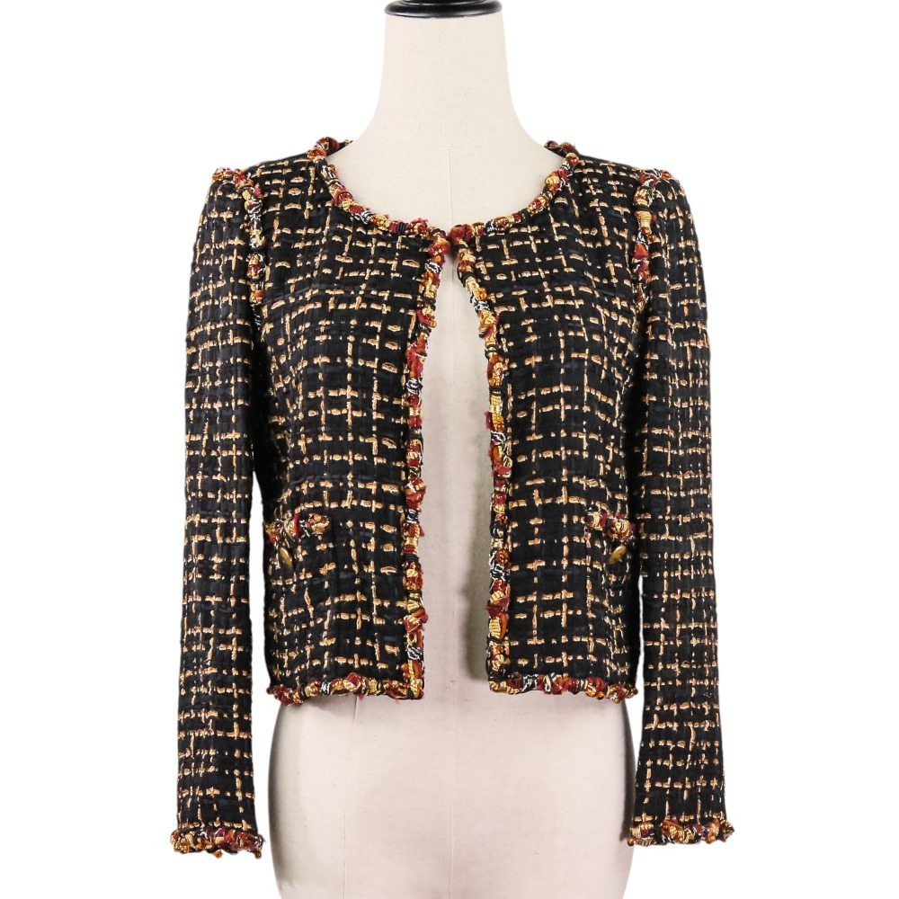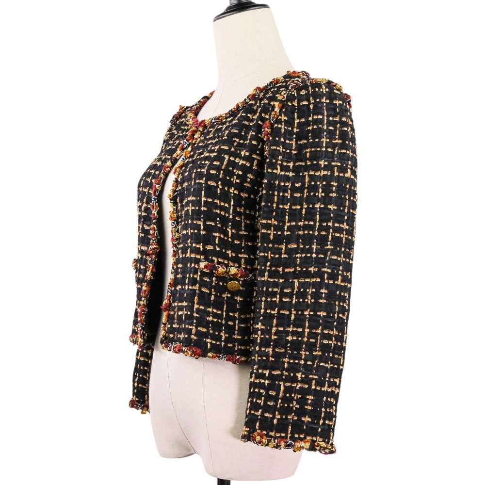 美品 CHANEL シャネル ビーズ装飾 ココマークボタン ノーカラー ツイード ジャケット P40226 サイズ36 ブラック ブラウン