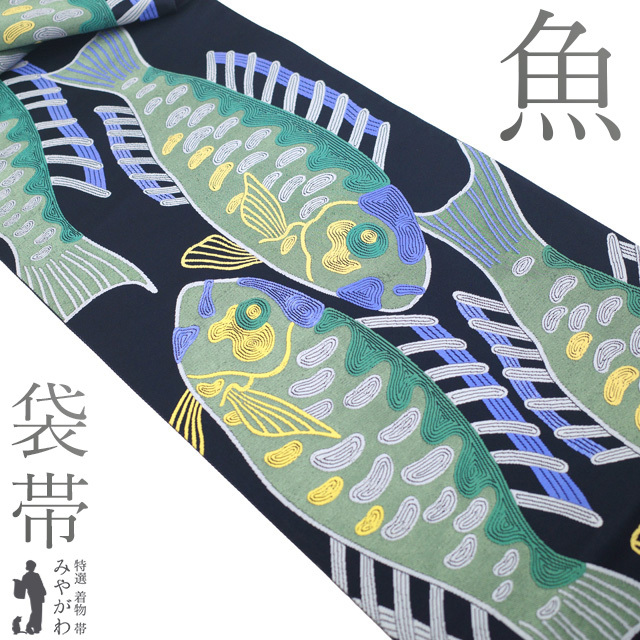 袋帯 リサイクル 正絹 京都 西陣 ラメ糸 黒 魚 サカナ レアデザイン おもしろ柄 上質 カジュアル 中古 仕立て上がり みやがわ sb54335