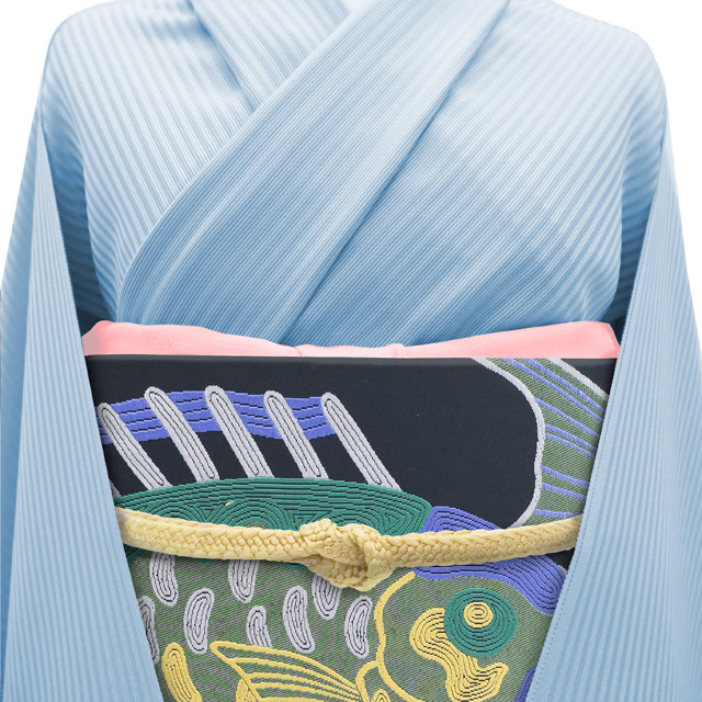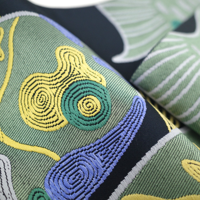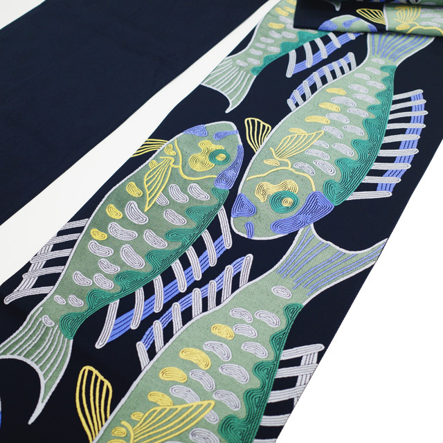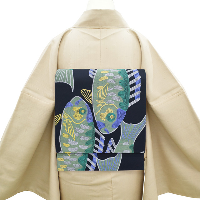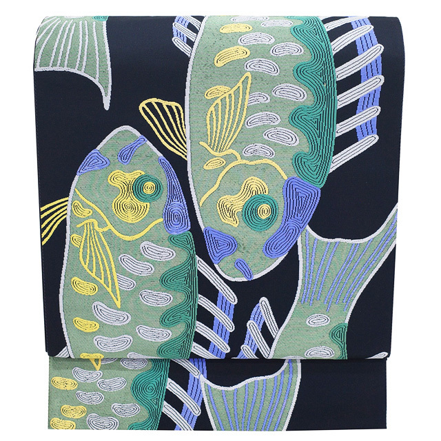 グリーンのラメ糸や青紫や、イエロー・グリーンの糸で丁寧に織り出された魚がまるで帯の上を泳いでいるかのよう。
