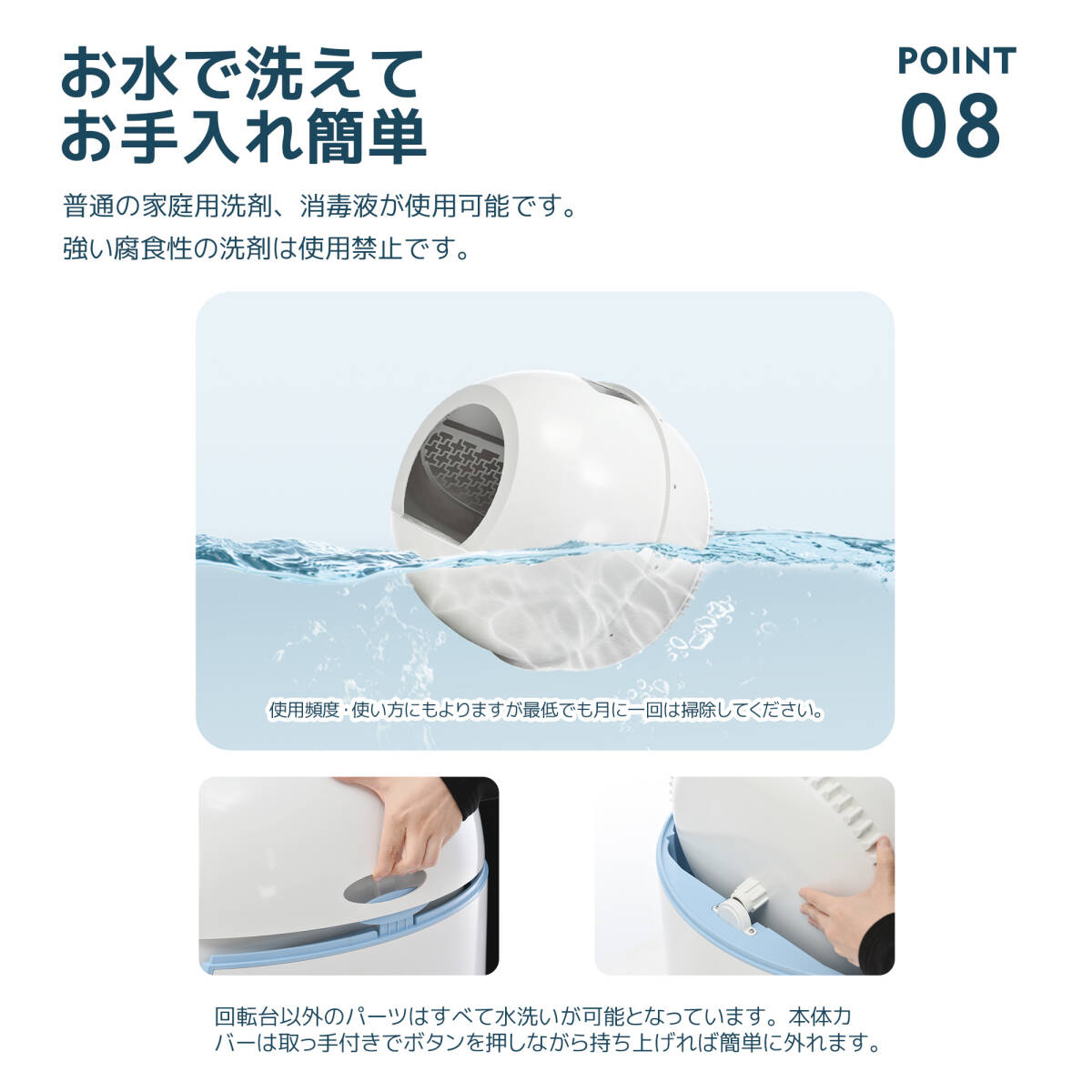 この商品について: ◎01 スマホアプリで遠隔操作 ◎02 優れた静音性 ◎03 丸みを帯びたデザイン ◎04 安心のセーフティ機能付き ◎05リアルタイムでお知らせ ◎06 10L大容量のダストボックス ◎07 1kg~10kgまで対応可能 ◎08 猫砂まで一気に清掃 ◎09 気になるニオイを軽減できる ◎010 お水で洗えてお手入れ簡単 商品の説明: ◆01 スマホアプリで遠隔操作 本体をWifiに接続し、スマホの専用アプリから、排泄物の清掃、槽内クリーニング、脱臭の操作を簡単に行えます。 ステップ1:アプリの登録(初めてご利用の場合は、「ログイン」を選択します。) ステップ2:デバイスのスタートアップ(本体前のボタンを10秒ほど長押します。) ステップ3:アプリとデバイスの接続 ◆02 優れた静音性 ドーム回転時の動作音はとても静かで、音に敏感な子も安心です。 ◆03丸みを帯びたデザイン 丸みを帯びたデザインはどこにいてもお部屋のインテリアに馴染むやすいです、 ◆04安心のセーフティ機能付き 挟み込み防止装置 猫の手足が挟まらない設計です。 重量感知センサー 台座の隅には4つの重力センサーが搭載され、猫がトイレから離れたことを検知した3分後(初期設定調節可能)にドラムが清掃が始めます。  猫がトイレに近づくと禁急停止します。 ・本製品を乾燥、平らで頑丈な場所に置いて動作してください。カーペットやヨガなどの柔らかい平面に置いてはいけません。 *体重が1kg~10kgの愛猫にご使用可能です。体重が1㎏未満だと感知できないので、生後3か月未満の仔猫および体重1kg未満の猫には使用をお勧めしておりません。 ◆06 10L大容量のダストボックス 猫一匹あたりおよそ20日間まで使用できます。 多頭飼いの方にも安心してご使用いただけます。 *うんち袋*3付属します。 ◆071kg~10kgまで対応可能 ゆとりあるの内部空間で大きな猫でも楽に出入りことができます。 *体重が1kg未満の子猫は電源を入れずにトレーニング用としてご使用ください。 猫砂の最大は6リットル(約2.5kg)です。猫一匹あたりおよそ20日間まで使用できます。 ◆08猫砂まで一気に清掃 猫砂を全量交換したい時に便利な「クリアランス」機能 「クリアランス」をクリックして、或いはボタンを7~10秒長押して、ドーム内の全ての砂をコンテナに落すことができます。 ◆09気になるニオイを軽減できる 先端のオゾン殺菌技術を採用しており、消臭剤が必要ありません。排泄物を処分した後、消臭を行い、いつもきれいに保ちます。一回約1分間です。 自動脱臭ON:掃除が終わるたびに自動的に消臭できます。 自動脱臭OFF:自動消臭をキャンセルし、手動で「消臭」プログラムでしか掃除できません。 ◆10お水で洗えてお手入れ簡単 回転台以外のパーツはすべて水洗いが可能となっています。本体カバーは取っ手付きでボタンを押しながら持ち上げれば簡単に外れます。 (使用頻度・使い方にもよりますが最低でも月に一回は掃除してください。) 注意: ・ご使用前にご自宅のWi-Fi環境をご確認ください。 ・本製品は2.4GHz帯に対応しておりますが、5GHz帯には対応不可となります。